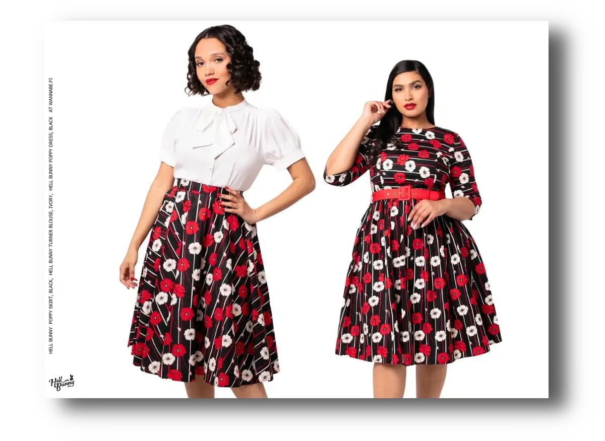 Retro-inspired clothing for women of all sizes (XS-4XL, some -6XL) and matching shoes.