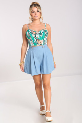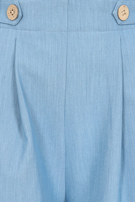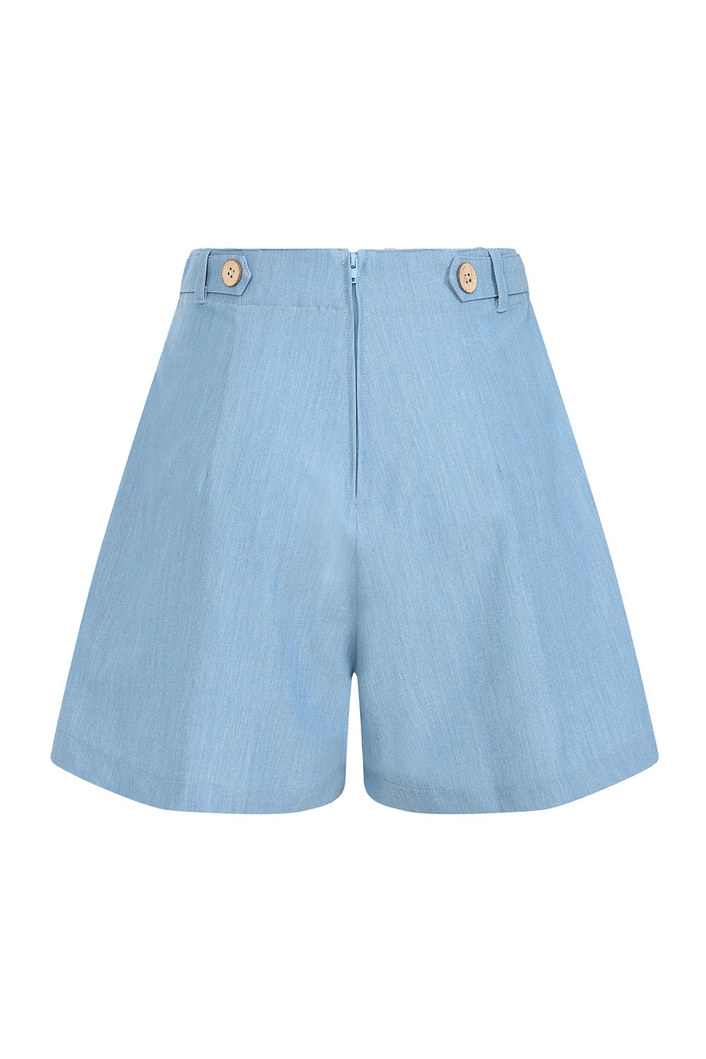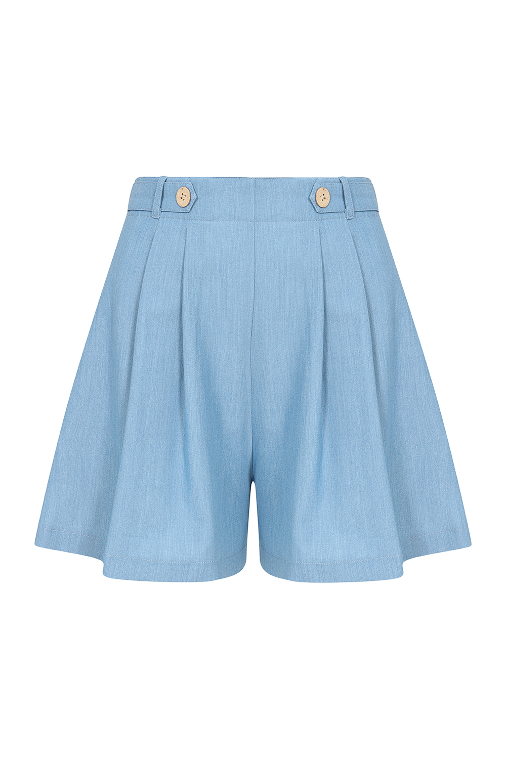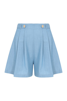 Wide-leg retro-style shorts. The light blue color, front pockets and wooden buttons on the waistband complete the impression.