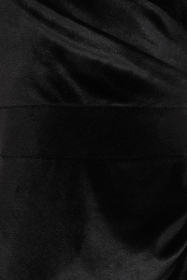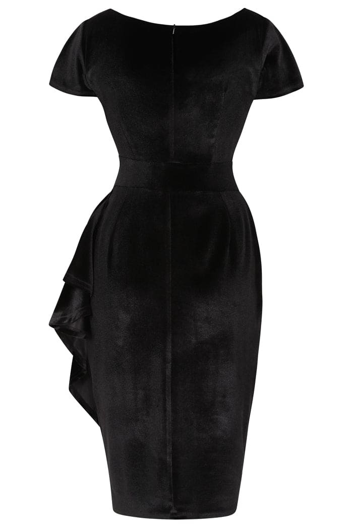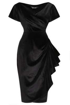 Luxurious, velvet pencil dress with wrap body part and short sleeves. The ruching on the side emphasizes the hips. Asymmetric hem below the knee.