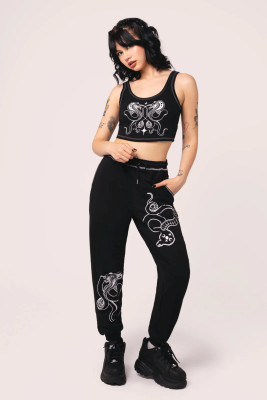 Make your mark in The Venom Joggers. These lightweight, jersey joggers feature a bold black base, etched with venomous white snakes printed on the front legs. White contrast stitching wraps the elasticated waistband and ribbed jersey cuffs, complemented by the adjustable silver toggles at the waist. Pockets in the side seams keep all of your treasures safe. Style with the Venom Crop Top for a cool and carefree look, or layer with The Venom Hoodie for those frostbitten days.