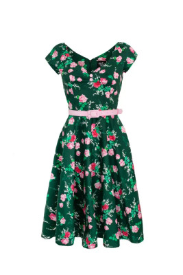 Deep green bell-shaped dress with a floral print, pink buttons and a belt. The vintage style is emphasized by raglan sleeves and a sweetheart neckline.