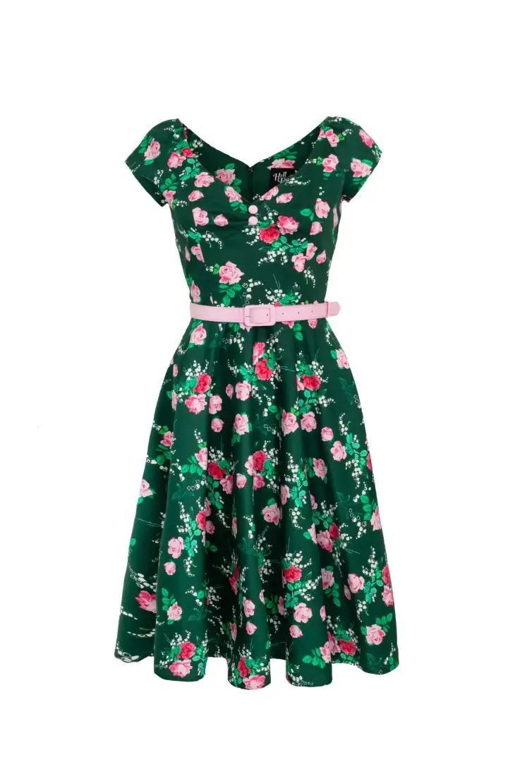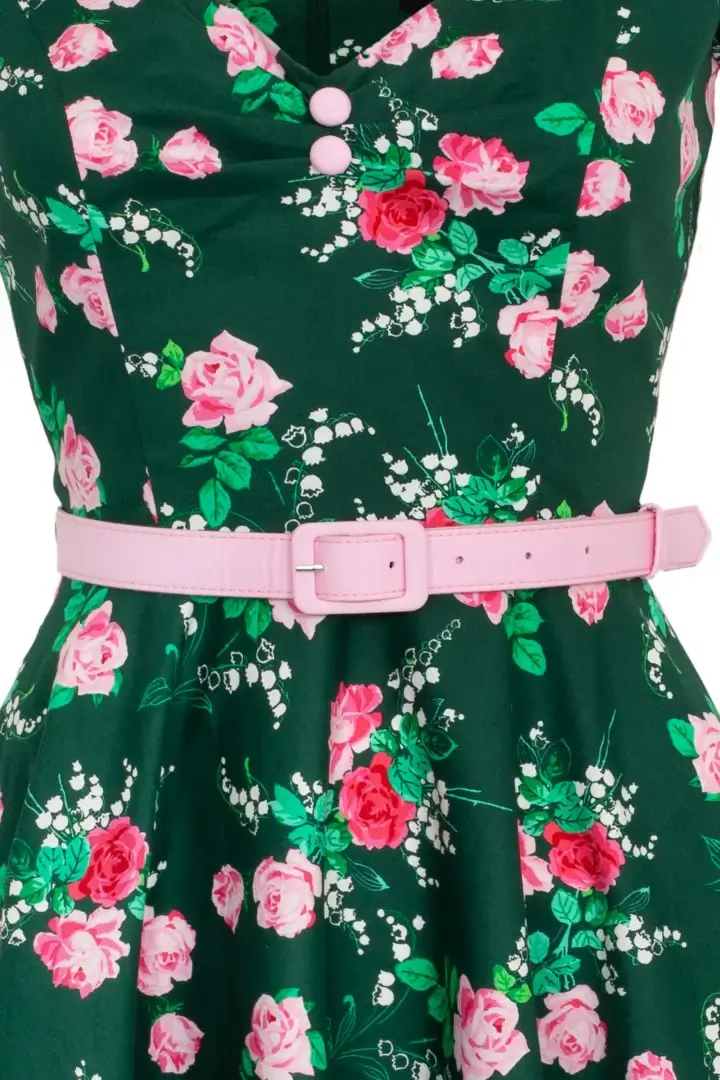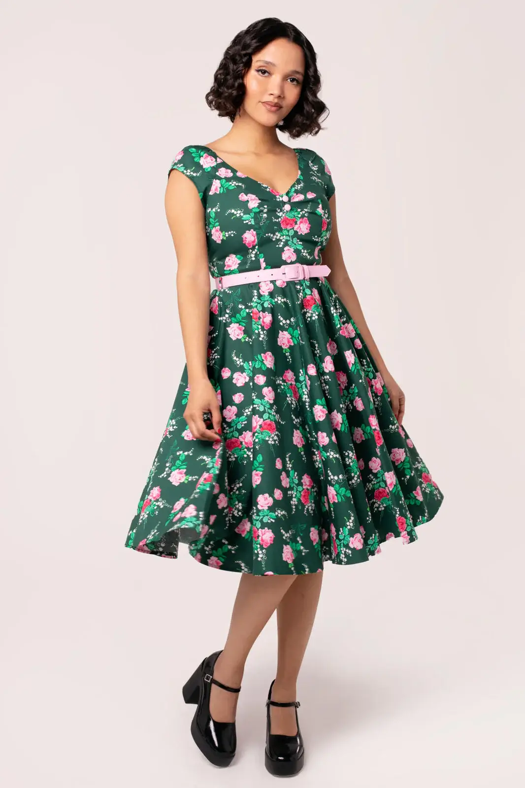 Everything's coming up roses with The Mabel Dress. This dress features a deep green base, decorated with vibrant artwork of blooming red and pink roses. Raglan style short sleeves sit just off the shoulder for the perfect vintage, feminine feel. The sweetheart neckline is enhanced with contrasting pink buttons at the chest front, which flatter the décolletage like the bodice highlights the waist. The full circle skirt flows from the waistline to create volume and twirl factor, dreamy on its own or emphasised with one of our petticoats. Style with the complementary pink belt for a true vintage vibe.