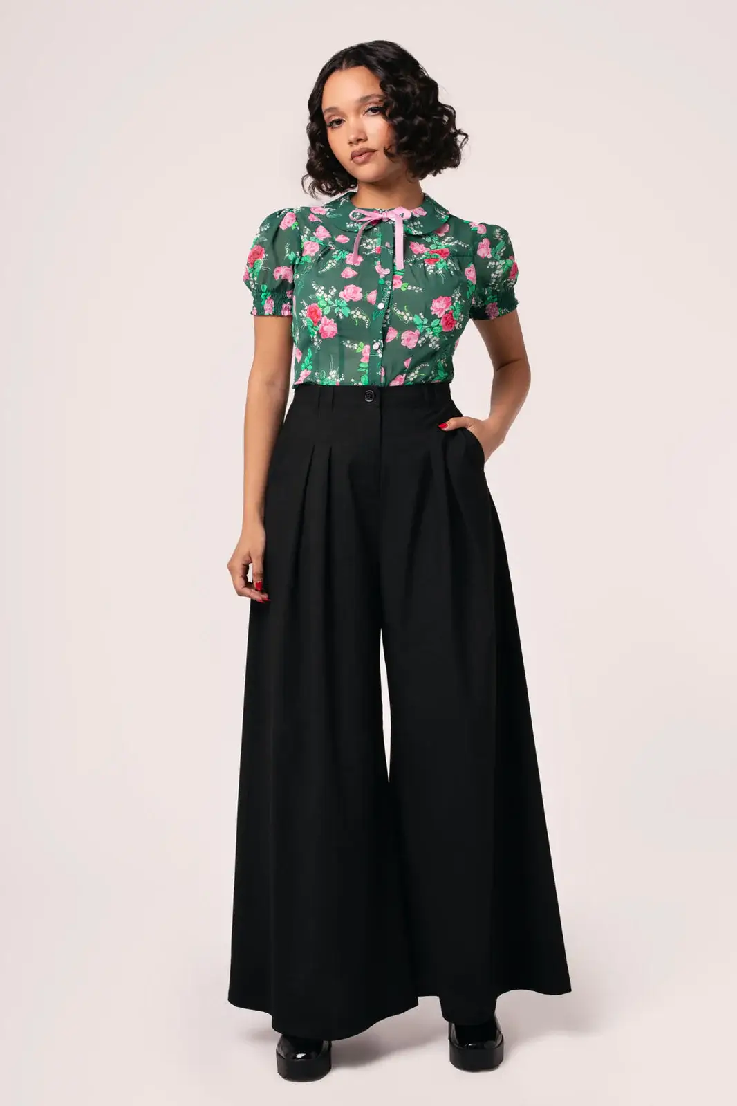 Take a (statement) stroll in The Simone Trousers. These high-waisted, super-wide leg swing trousers offer comfort and style with every move. The tailored like fabric offers a chic feel to your everyday wardrobe. The front features 4 neat pleats that create volume and drama. Tuck in our Turner Blouse for a preppy, vintage look that’s great for any occasion.