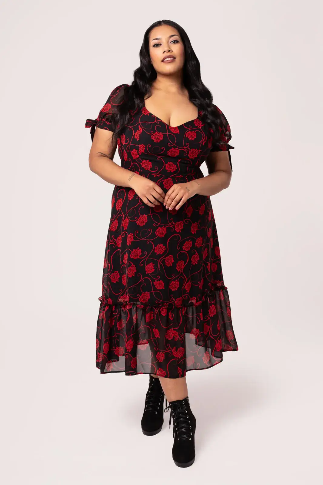 Where the wild roses grow, you’ll find The Thorn Dress. This chiffon dress features a bold black base, decorated with blood red roses and trailing, thorny vines. The sweetheart neckline flatters the chest, before the fitted bodice hugs the waist for a flattering silhouette. Short puffed sleeves are finished with adjustable tie cuffs for comfort and style. The A-line skirt flares from the waist seam into an elegant midi skirt, with a gathered panel for added allure.