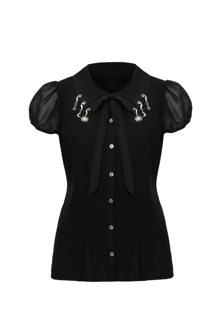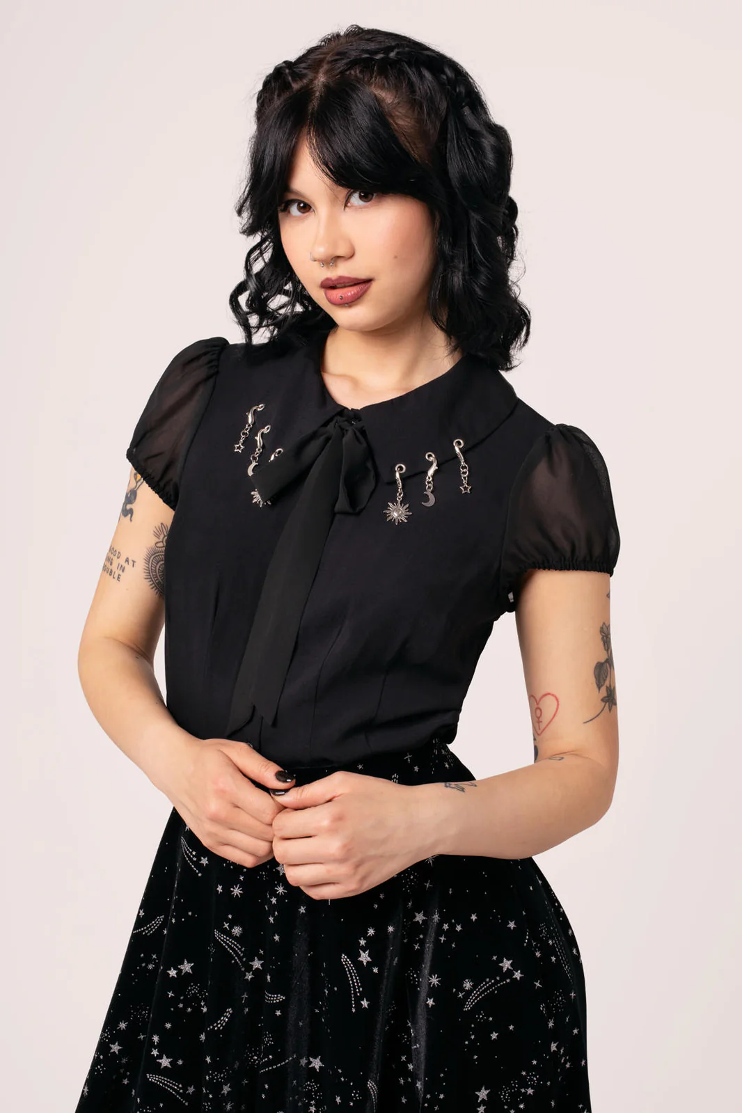 Cast your spell with The Charming Blouse. This gothic, semi-fitted blouse features a bold black base, with a large curved collar decorated in detachable, celestial silver charms. A removable tie at the neck adds a preppy, witchy school feel. Short puffed sleeves are gathered with elasticated cuffs for comfort, and glittery buttons add a touch of drama to the front fastening. Darts in the front and back offer shape to hug your figure. The length finishes to the hips, making this blouse perfect for tucking into our statement trousers and midi skirts for an effortless look.