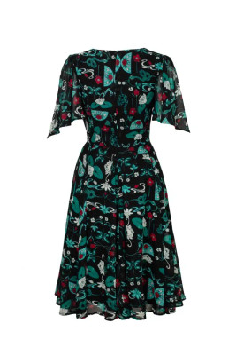 Chiffon dress with a teal/red stained glass print, pleated sleeves and jersey lining. A V-neckline and flared hem complete the ethereal silhouette.