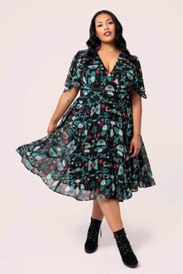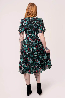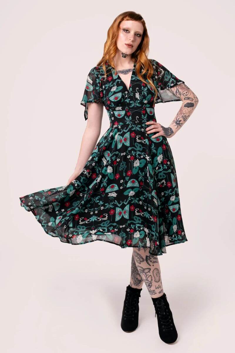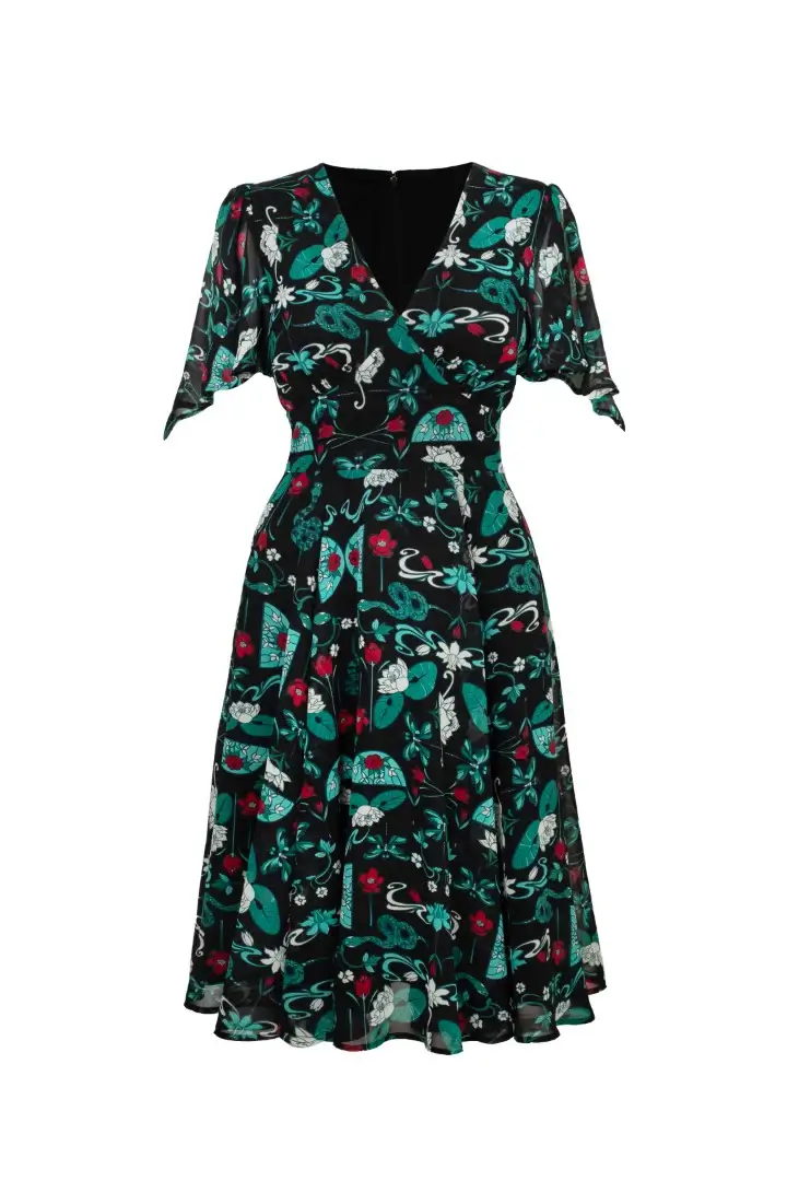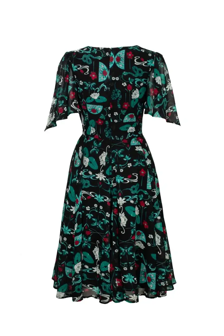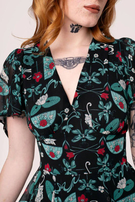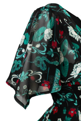 This chiffon dress is made from teal and red stained glass inspired artwork, scattered across a deep black base. Draped sleeves add mystery and etherealism. The V-neckline with decorative wrap over bust detail enhances the décolletage, while the fitted bodice flares at the waist seam for added twirl factor. Black jersey lining ensures comfort and coverage for whatever the day may bring.