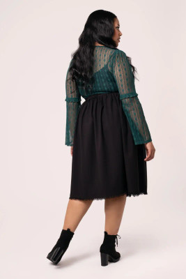 Add some mystery to the everyday with The Danica Skirt. This midi skirt exudes witchy essence through it deep black base, enriched with white sun and moon tarot-inspired embroidery on the pockets. The waistband meets at the button-up front fastening, before trailing to the lace hem with the voluminous gathers. Pair with our Danica Blouse for an elevated, ethereal look that’s perfect from dusk till dawn!
