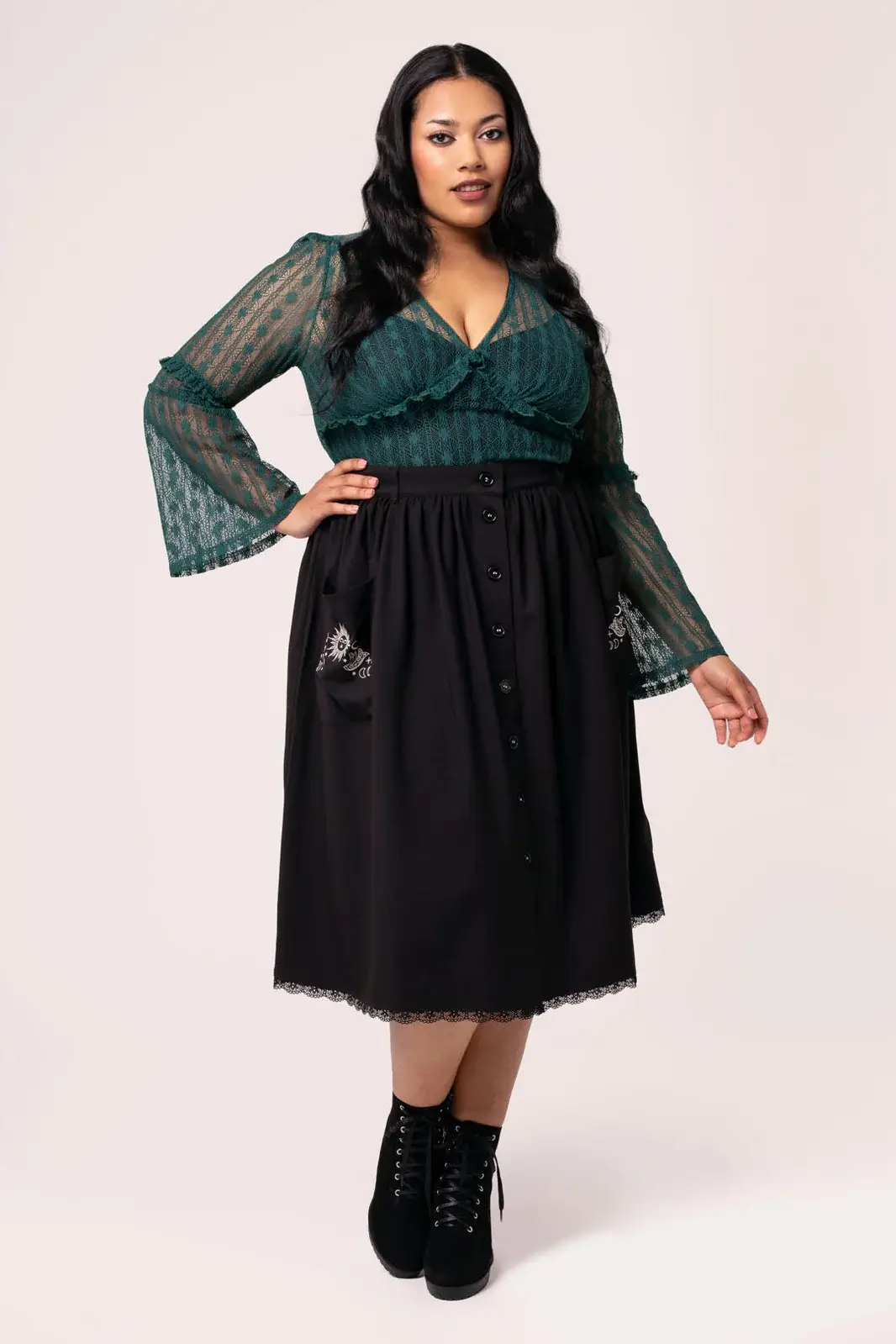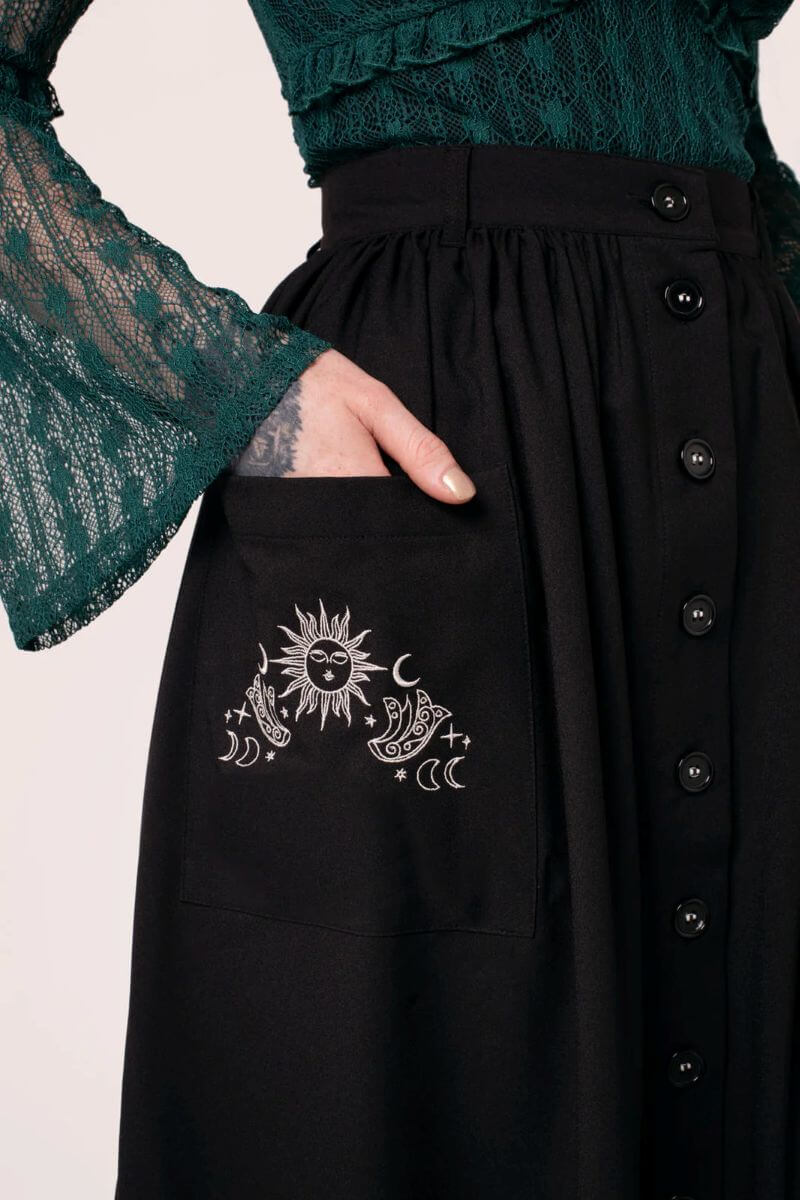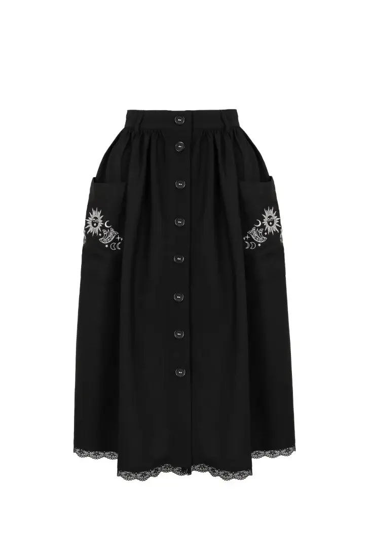 Hell Bunny Danica otherwise black midi skirt has white moon and sun embroidery on the outer pockets. Black lace trim on the hem. Button fastening at the front.