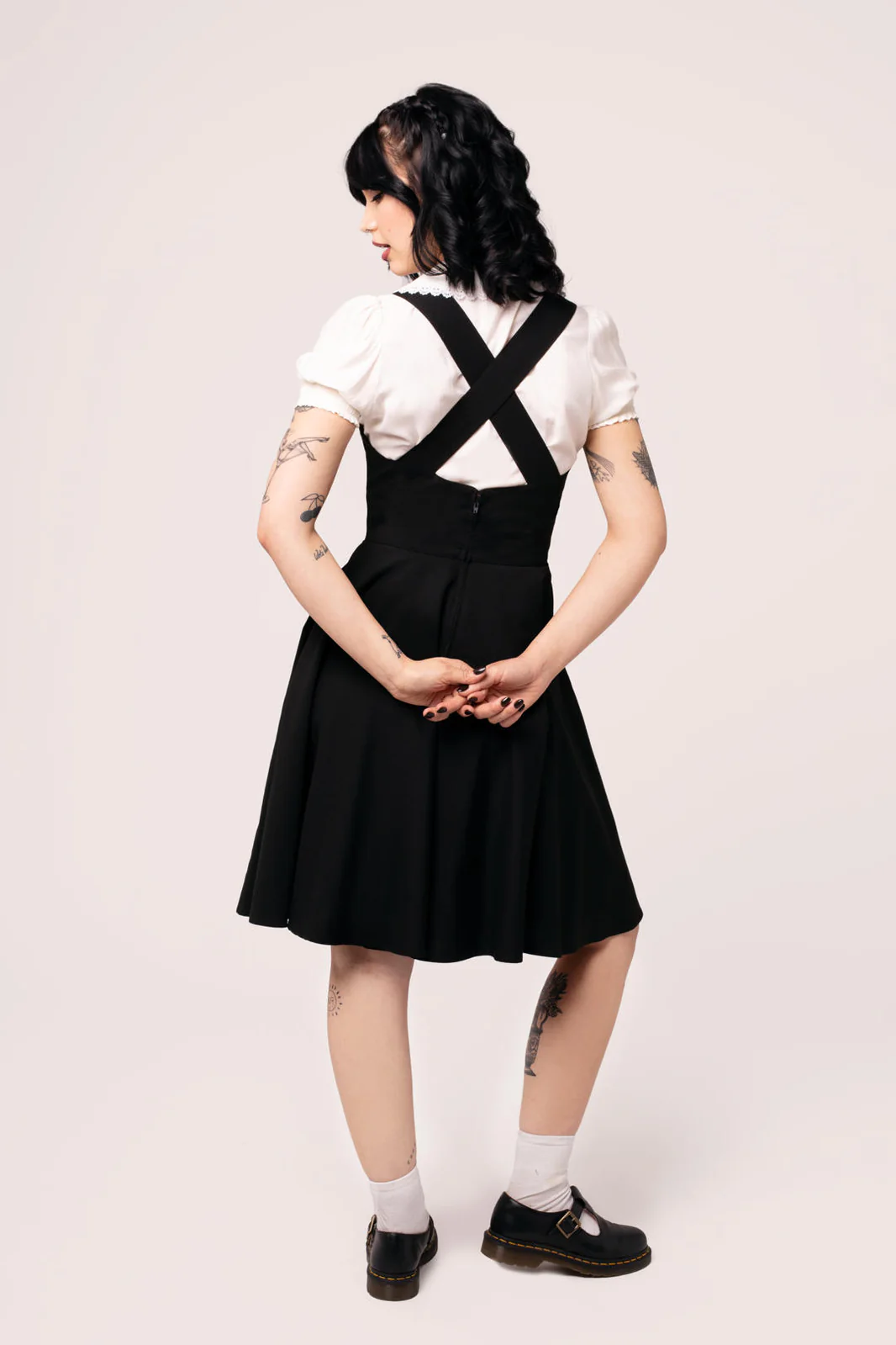 Simple yet stylish, that’s The Patti Pinafore Dress. This dress is a pinafore style design, with crossover straps at the back, and buttons at the front to adjust. Available in emerald green, ruby red, or onyx black, the Patti Pinafore Dress suits any occasion. The bodice hugs the figure before flaring from the waistband to create a voluminous skirt, with hidden pockets in the side seams. Style with our Autumn blouses underneath for a preppy look, or wear on it’s own for a glamorous feel.Zip in the centre back with hook & eye at top.