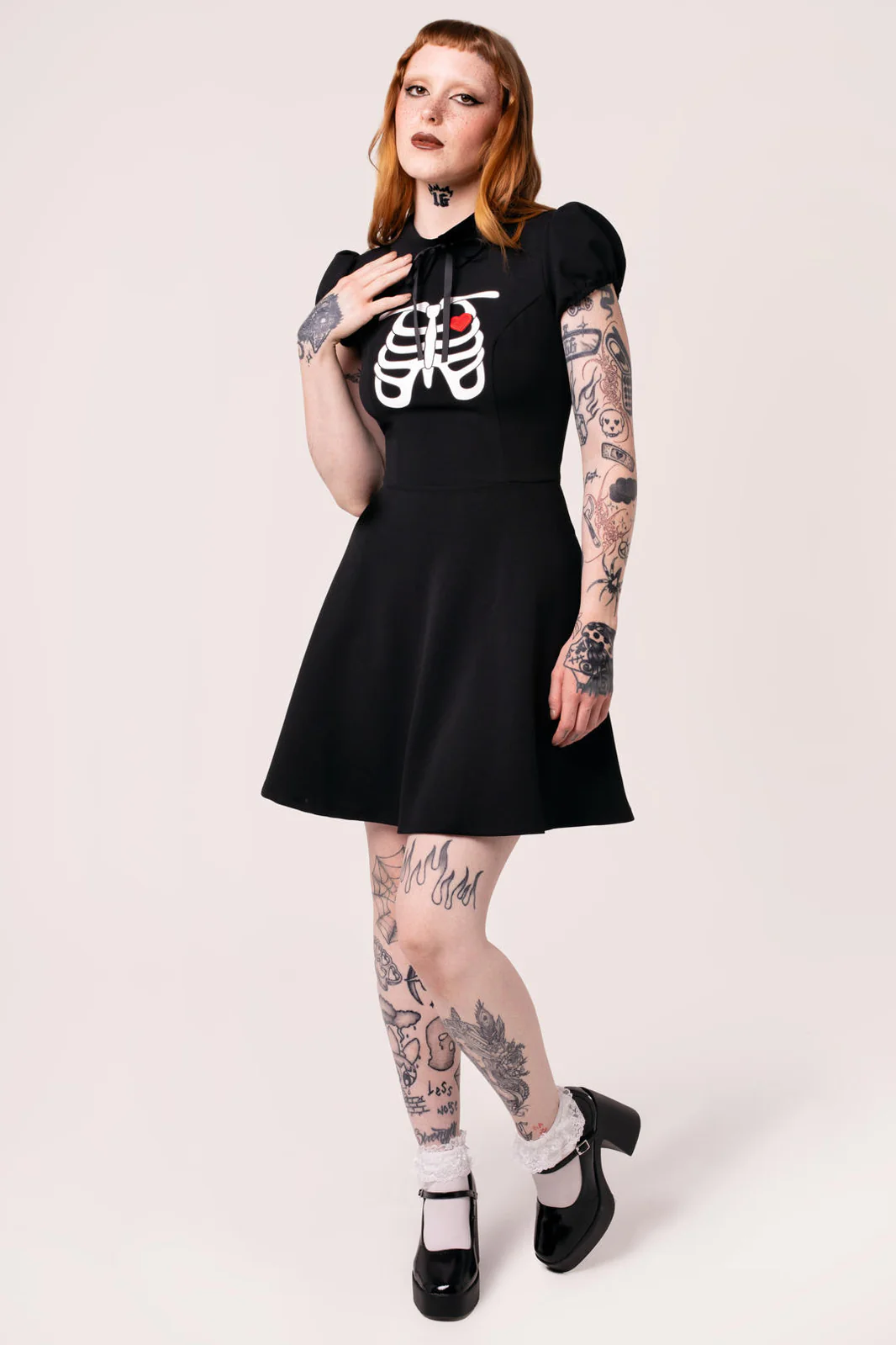 Halloween just got cuter with The Skeleton Girl Dress. This bold black jersey mini dress features statement artwork of a ribcage print and heart applique on the chest. A small pointed collar is finished with a dainty black bow at the neck. Short puffed sleeves add a delicate touch to this dark dress. The fitted bodice shapes until the waistline, before flowing into a flared skirt with pockets at the side seams, perfect for keeping all of your trinkets safe whilst you dance the night away.