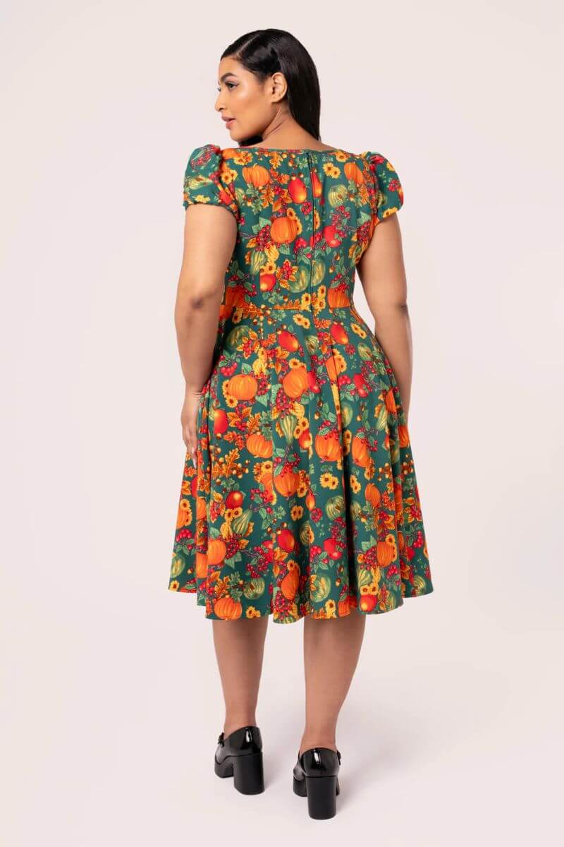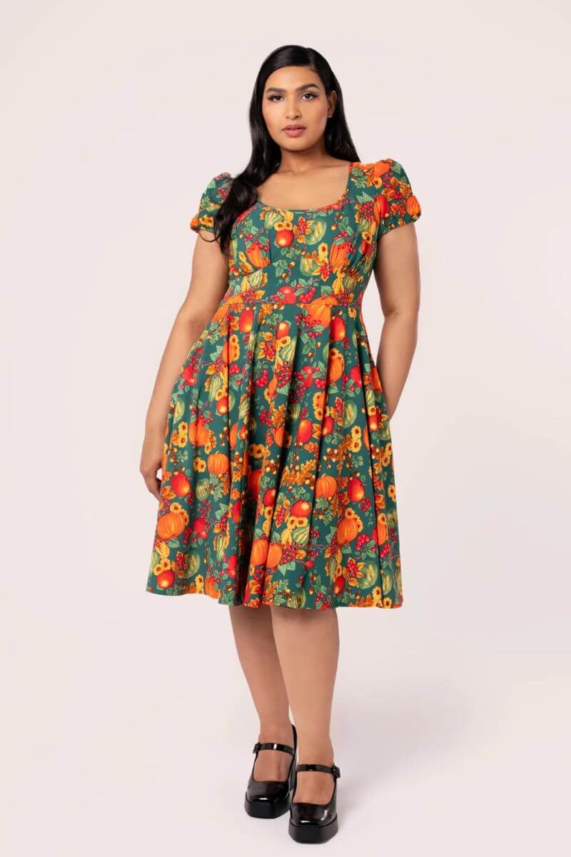 You’ll be the pick of the pumpkin patch in our Pumpkin Patch Dress! This dress features a deep green base, decorated with vibrant artwork of the freshest pumpkins and seasonal vegetables. Capped puff sleeves give the perfect vintage, feminine feel. The scooped neckline is enhanced with contrasting trim, which flatters the décolletage like the bodice highlights the waist. The bodice hugs the figure before flaring at the waist to create a beautiful midi skirt, perfect for any Autumnal occasion!