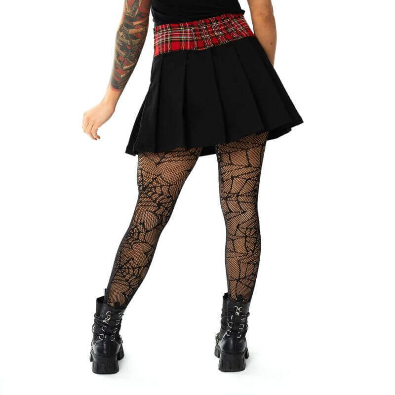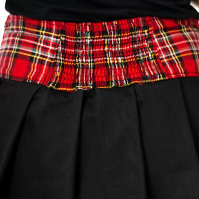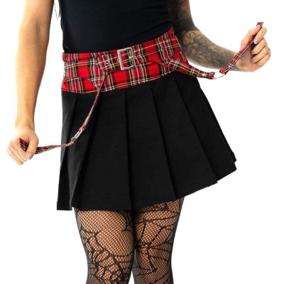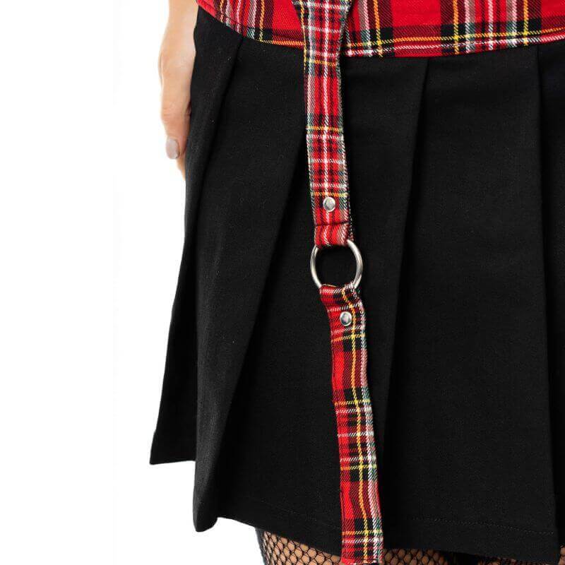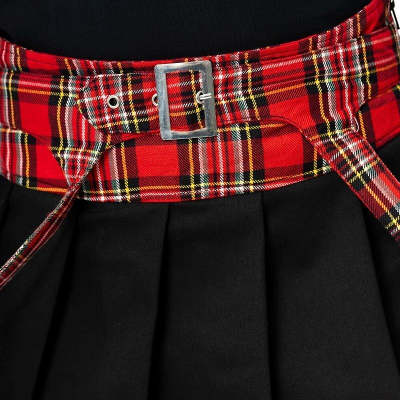 The Bobbi mini skirt combines classic red and black tartan, the volume of pleats and the rebellious look of a strappy belt.