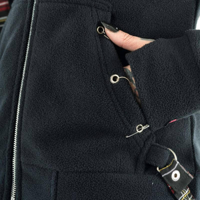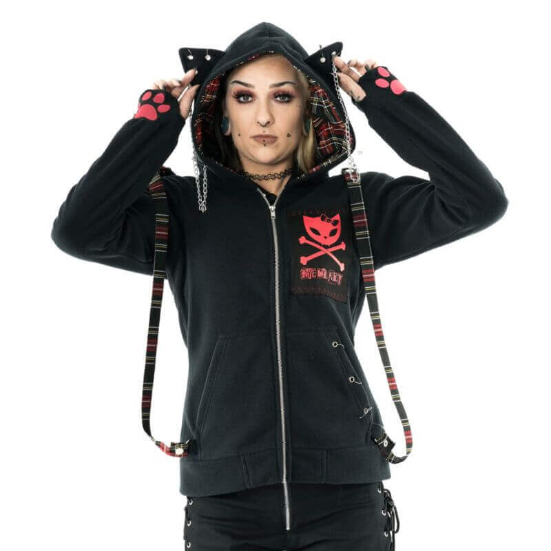The Innocent Trinity fleece hoodie is the perfect choice for those who want softness but don't compromise on attitude. The black hoodie is enlivened by a black and red tartan pattern on the inside of the hood and straps that run from the shoulders to the pockets. The hood has cute ears decorated with studs and metal chains with safety pins - details that give the hoodie its own rebellious character. There is a zipper closure at the front and two practical front pockets, one of which has a stud decoration. Thumbholes at the cuffs of the sleeves complete the comfort and bring a sporty feel. Trinity is the perfect combination of playful goth punk and cozy streetwear.