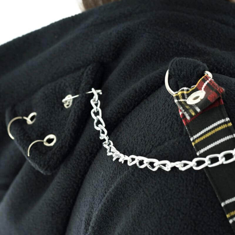 The Trinity hoodie combines soft fleece with punk-inspired tartan and chain details.