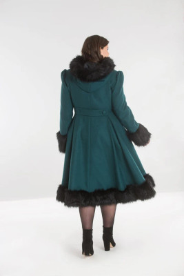 Vintage-inspired green jacket with black faux fur trim. A decorative waistband and a full hem create a feminine silhouette.