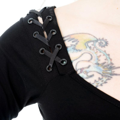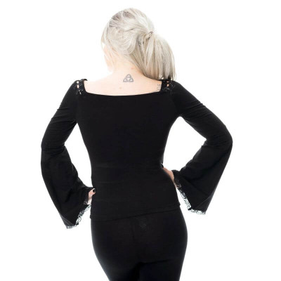 Black jersey top with a sweetheart neckline and corset lace details. Flared sleeves with lace trim add a romantic gothic touch to your outfit.