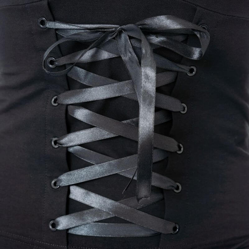 The INNOCENT Maelys top combines gothic style with feminine elegance. The black jersey top has a flattering sweetheart neckline and corset lacing panels on the shoulders that accentuate the upper body. The elastic band at the back of the neckline increases comfort and fit. The corset lacing from the waist to the hem creates a beautiful shape and emphasizes the silhouette. The gorgeous, wide sleeves end with lace edges that add a sophisticated finish to the whole.