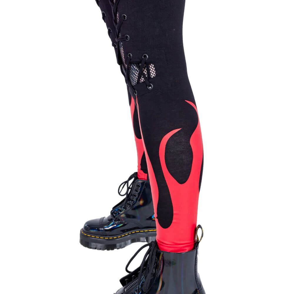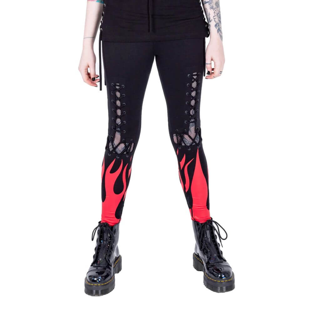 Black and red gothic leggings with a flame pattern and striking corset lacing on the front.