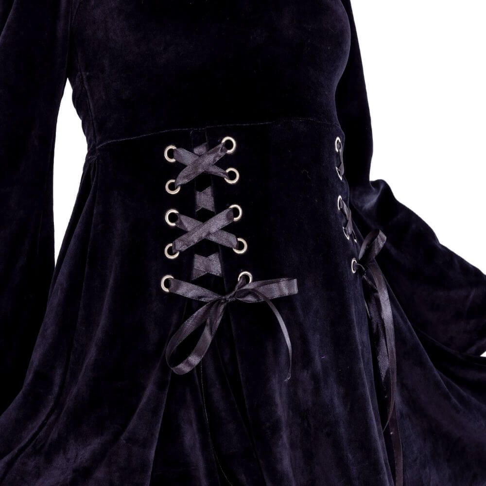 Marion is a velvet mini dress that combines soft material, a strong silhouette and a gothic attitude. The black velvet surface adds depth and solemnity to the dress, while the corset lacing at the front of the skirt creates a striking and body-flattering look.