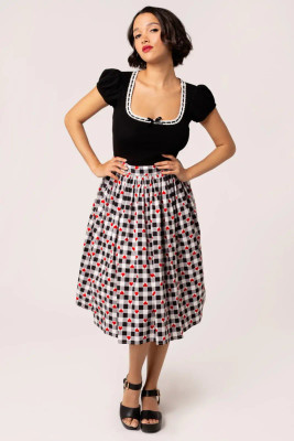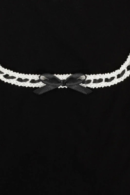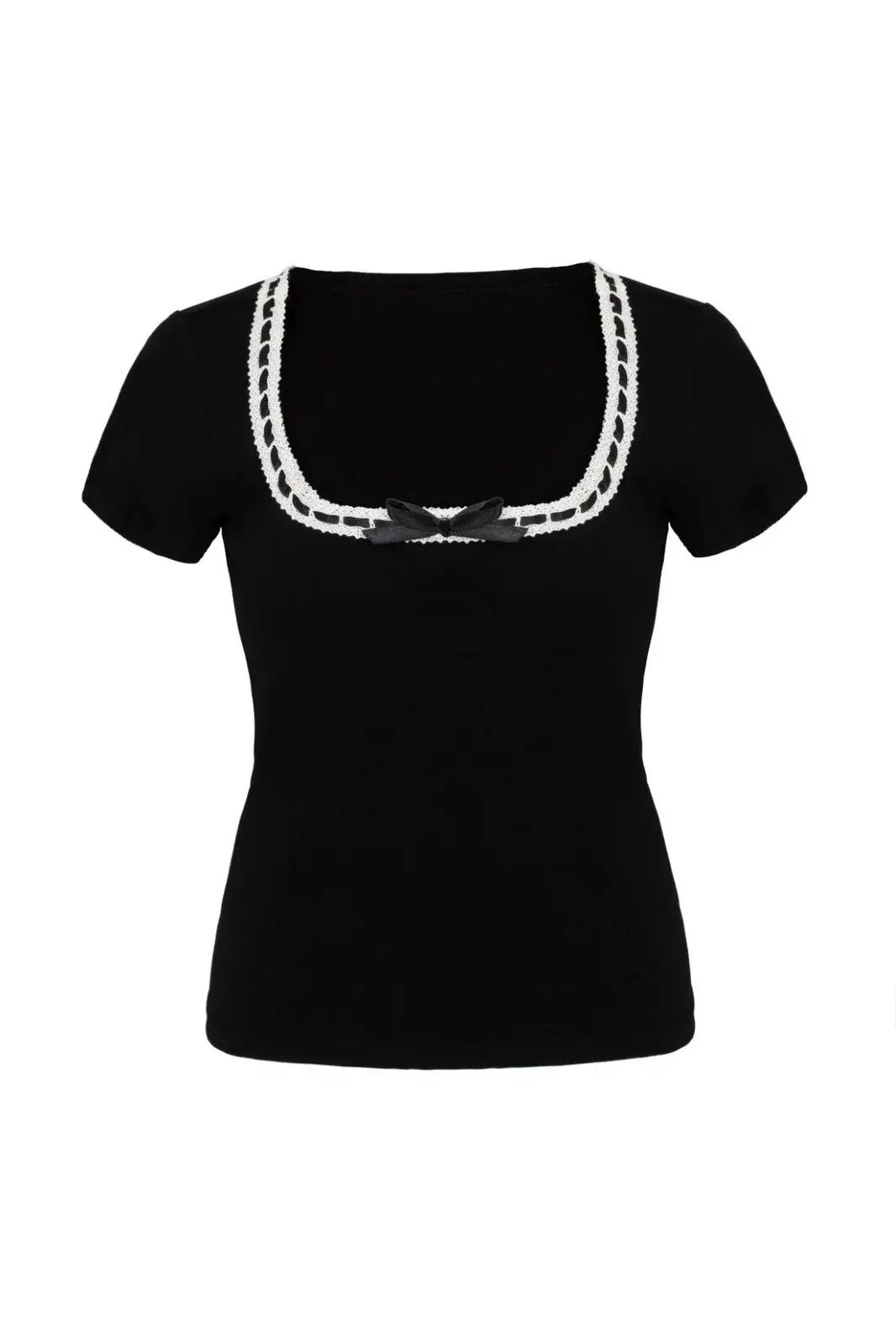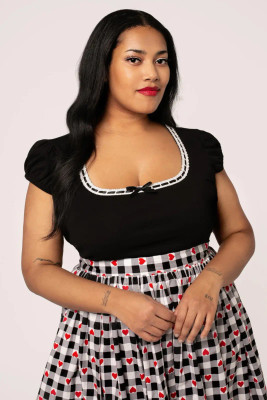 Black, fitted jersey top with a deep neckline, lace trim and bow. A timeless Hell Bunny classic for everyday and evening wear.