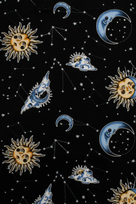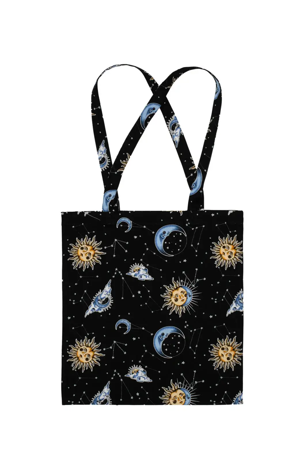 Hell Bunny Solaris tote bag with a black base. The pattern of moons, suns and stars brings a touch of celestial style to everyday life.