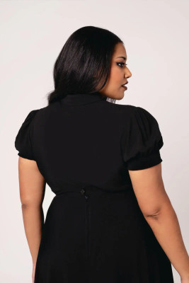The body-hugging cut makes the blouse neat and upright, and the length reaching to the hips works great with high-waisted skirts and trousers. The short puff sleeves and elastic ruffled cuffs bring a light contrast to the whole.