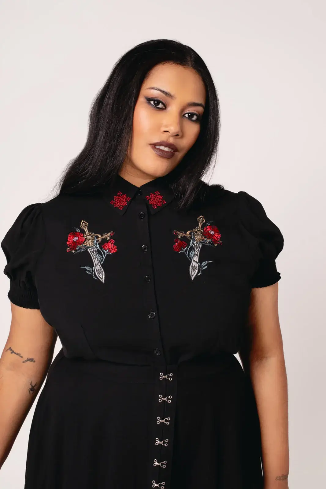 Hell Bunny Elyse is a black viscose blouse with an embroidered sword, a collar decorated with red details and a fitted fit.