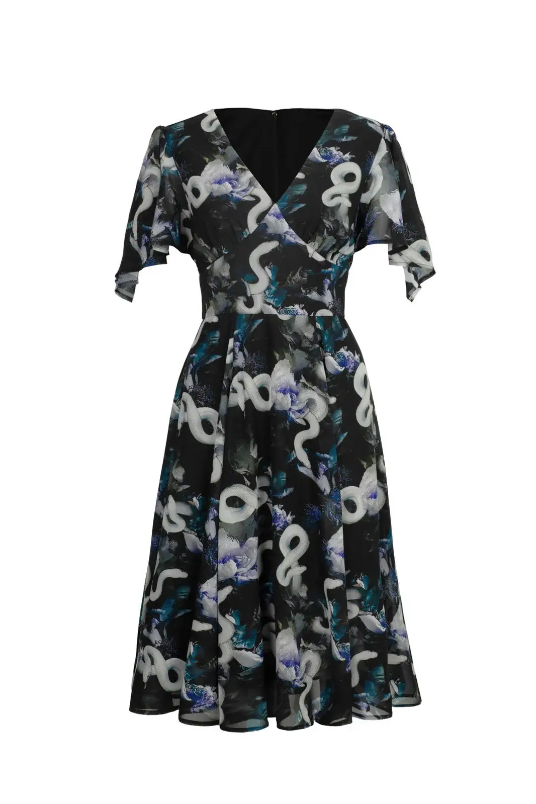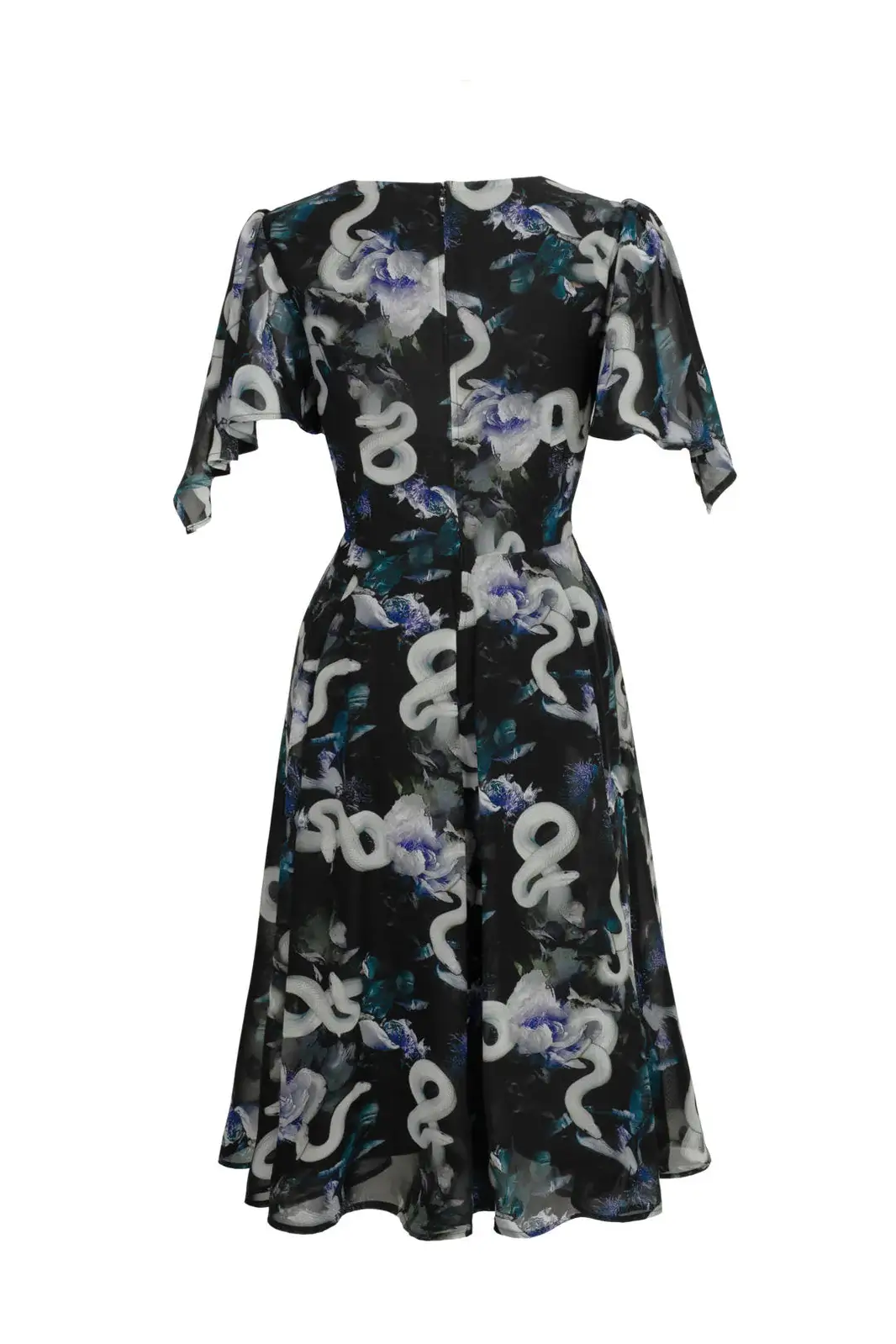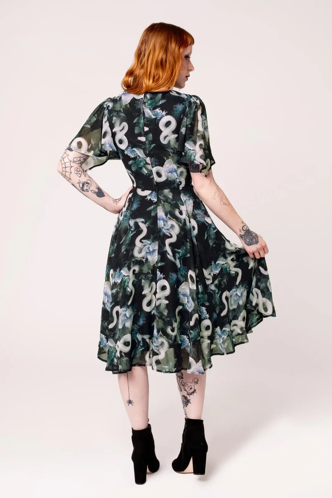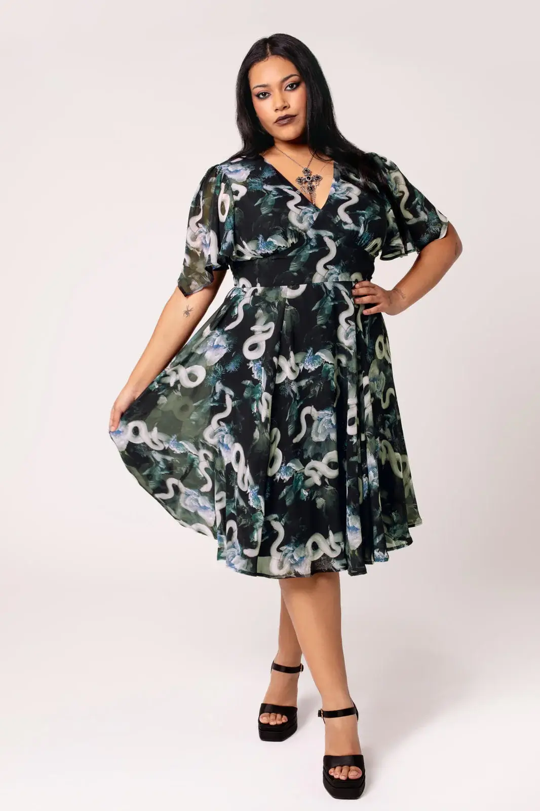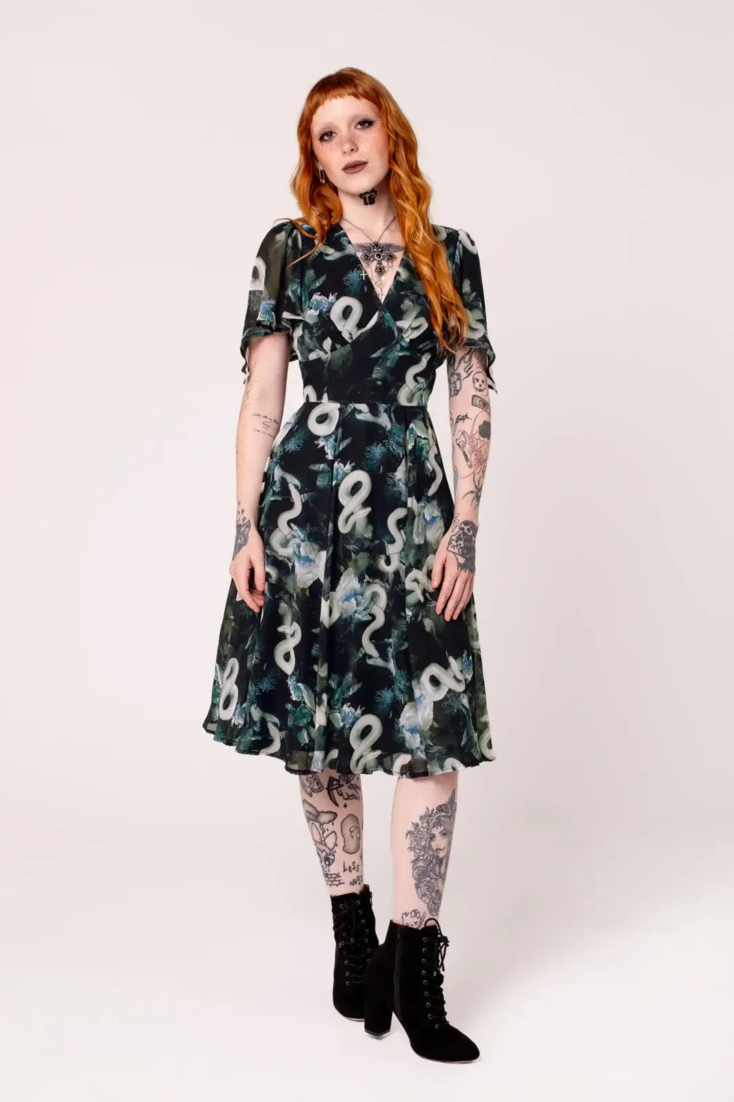 Hell Bunny Serpent is a mid-length chiffon dress with a snake pattern and blue-toned floral pattern creating a dark, elegant and airy ensemble.