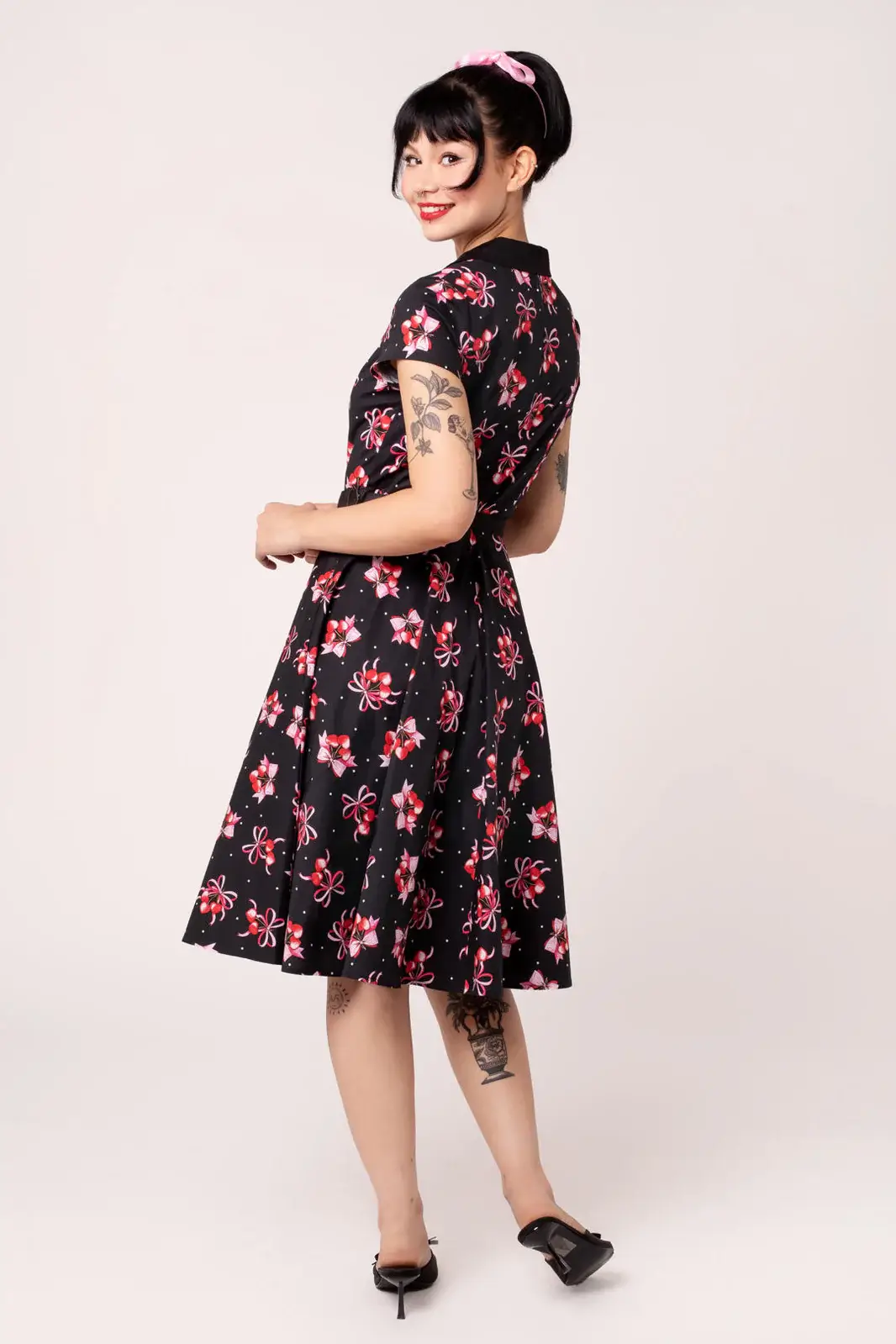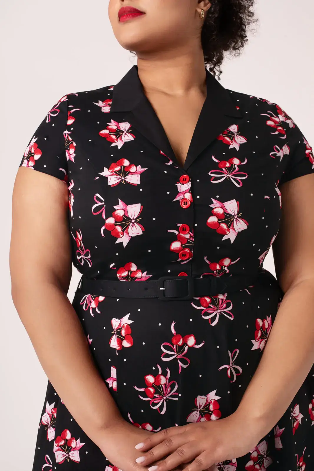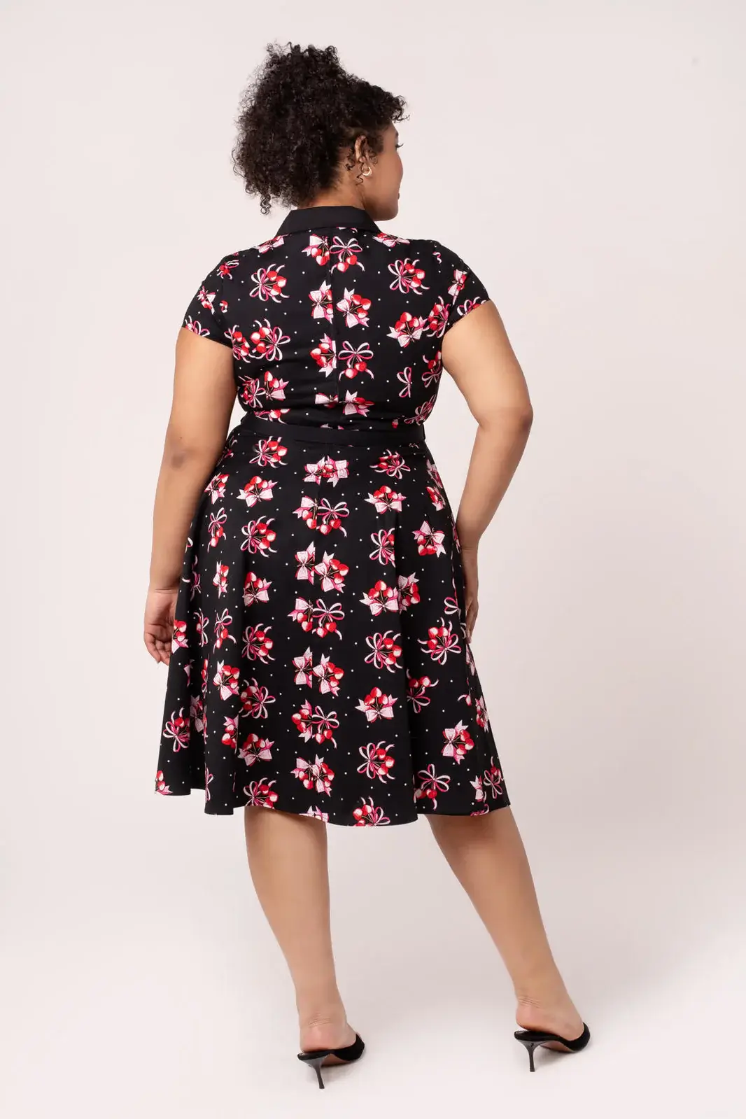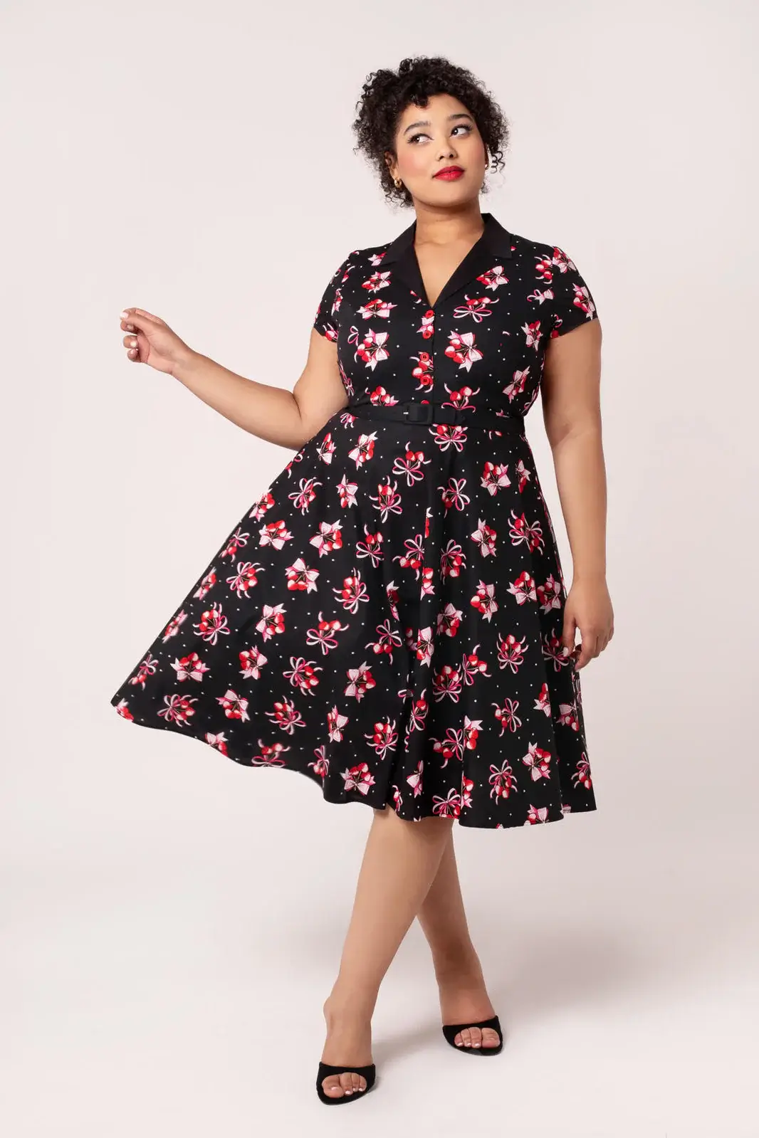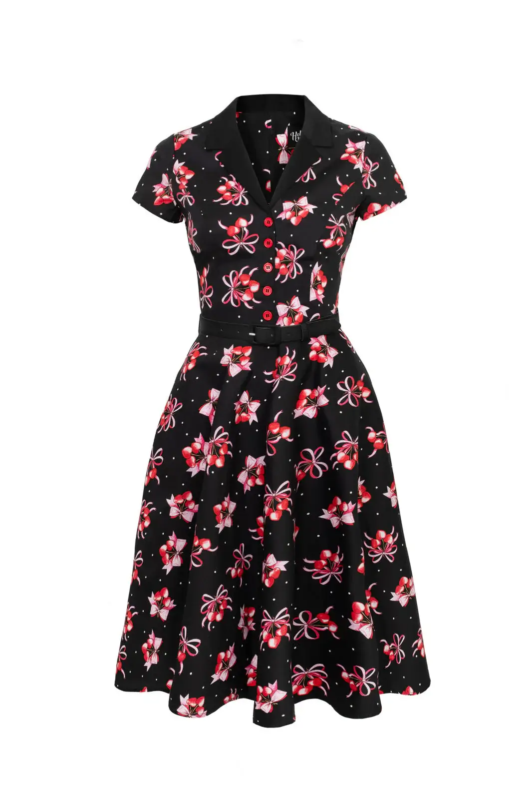 A classic 50s shirt dress with a cherry heart pattern. The bell hem, belt and pockets make Cherilyn a timeless and practical favorite.