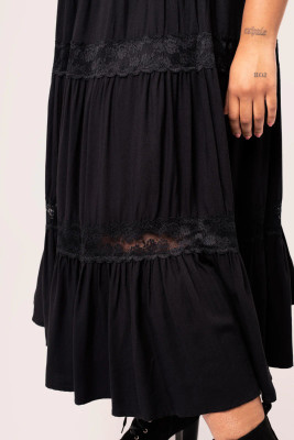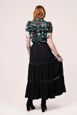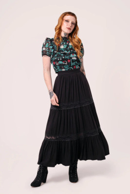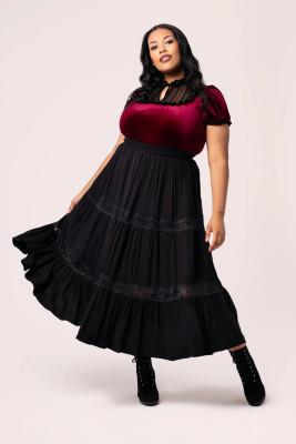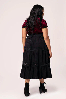 Hell Bunny Nocturnal is a striking black midi skirt that combines a soft flow with a deliberate drama. The generous gathers starting at the waist give the skirt movement and volume, while two lace panels divide the hem into layers and bring in a gothic sophistication.
