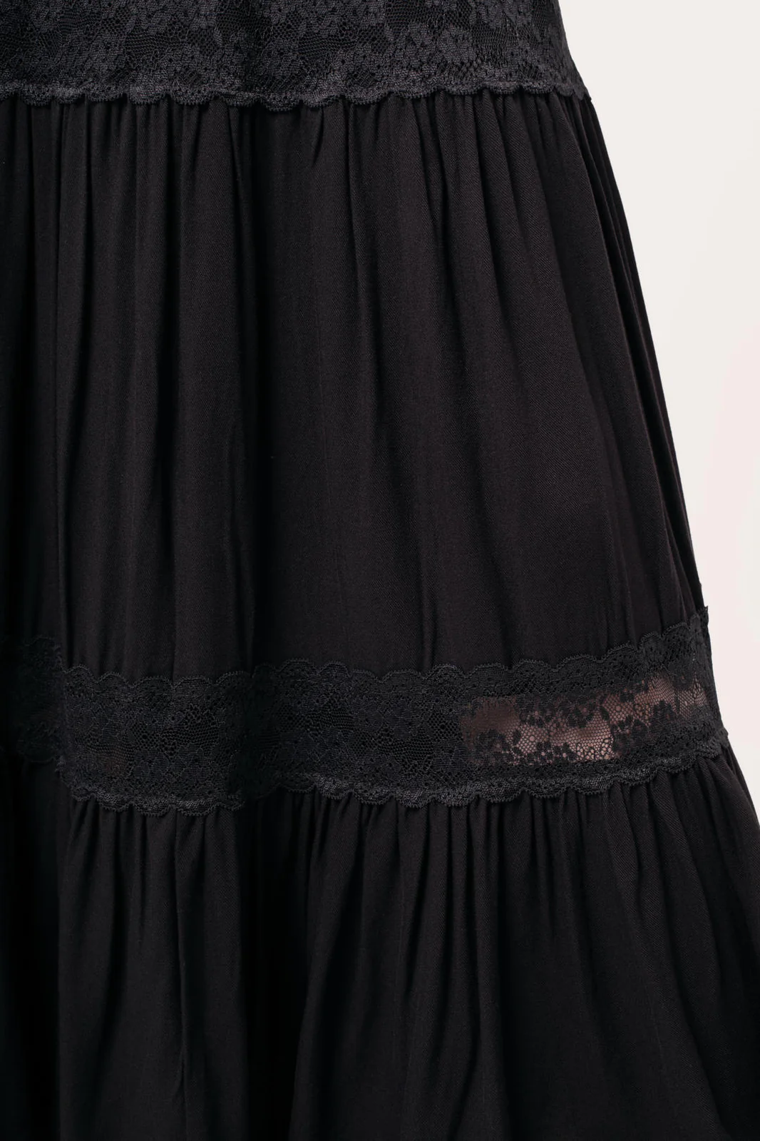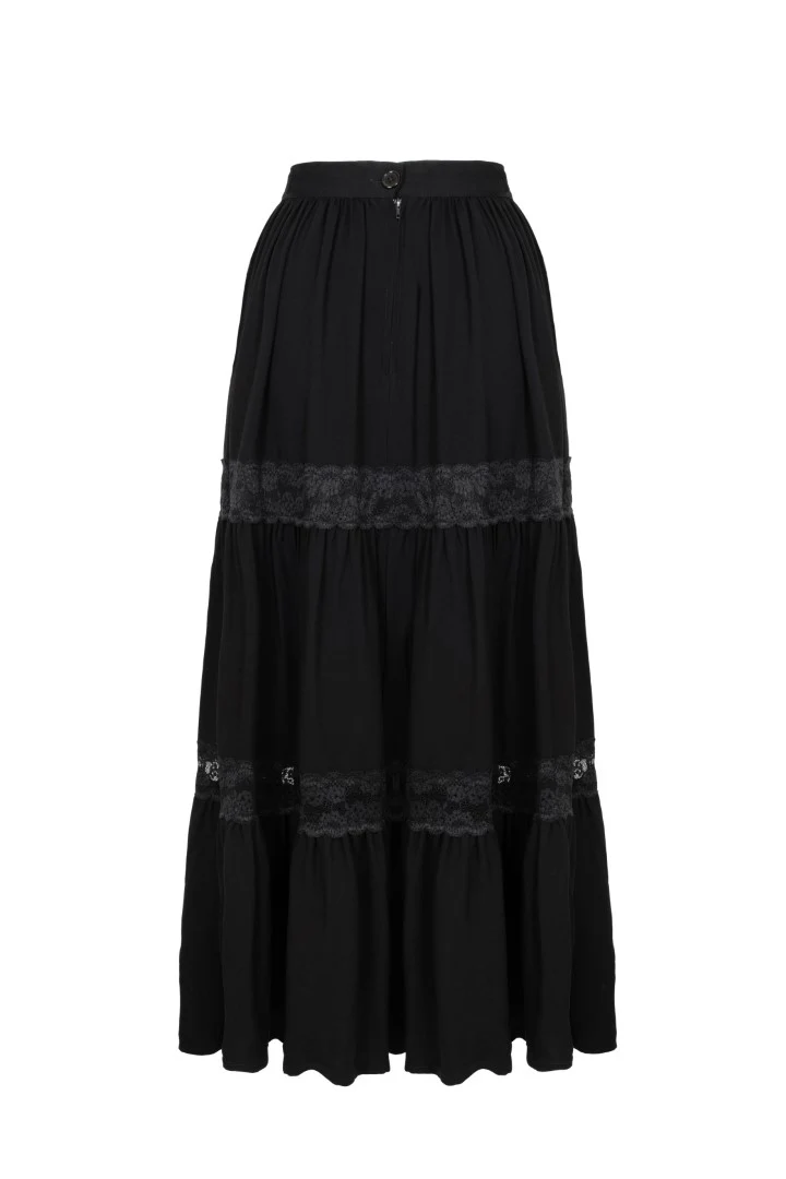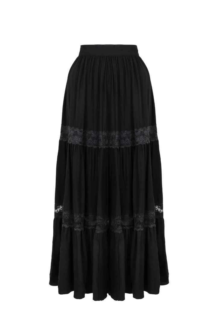 A layered black midi skirt with rich ruching and two lace panels. A dramatic silhouette and a strong, dark look.