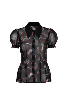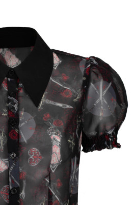 Black chiffon blouse with armor and sword print. Pointed collar, puff sleeves and ruffled cuffs balance strength and delicacy.