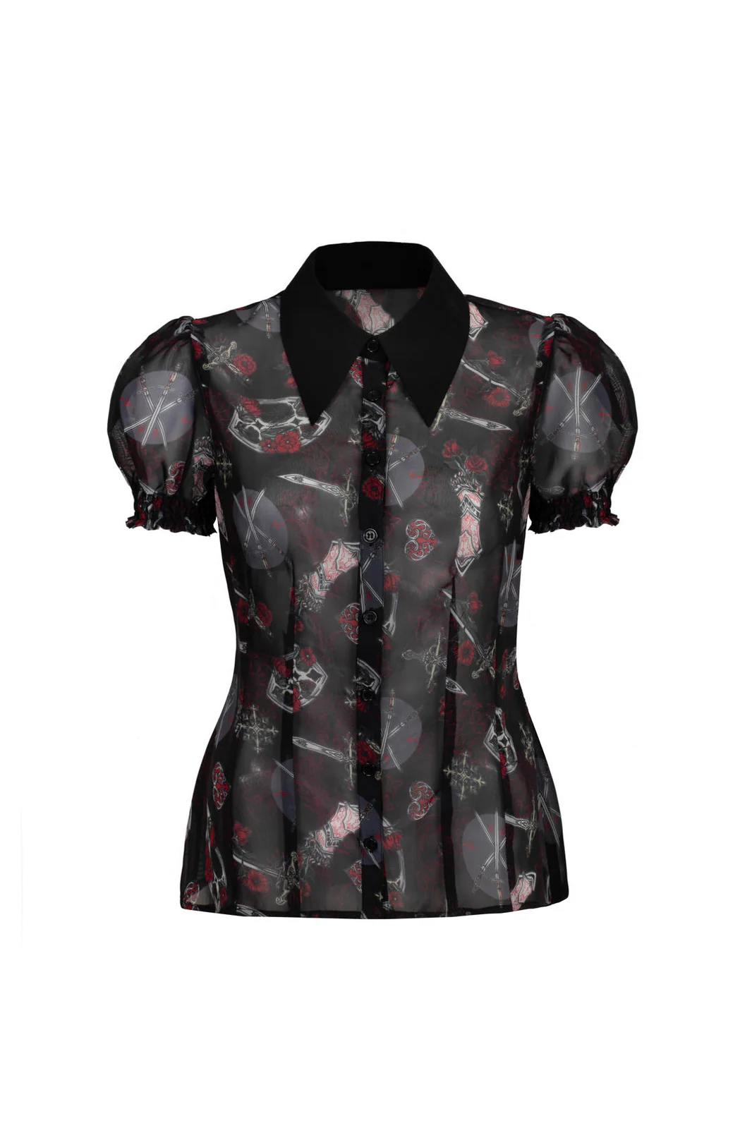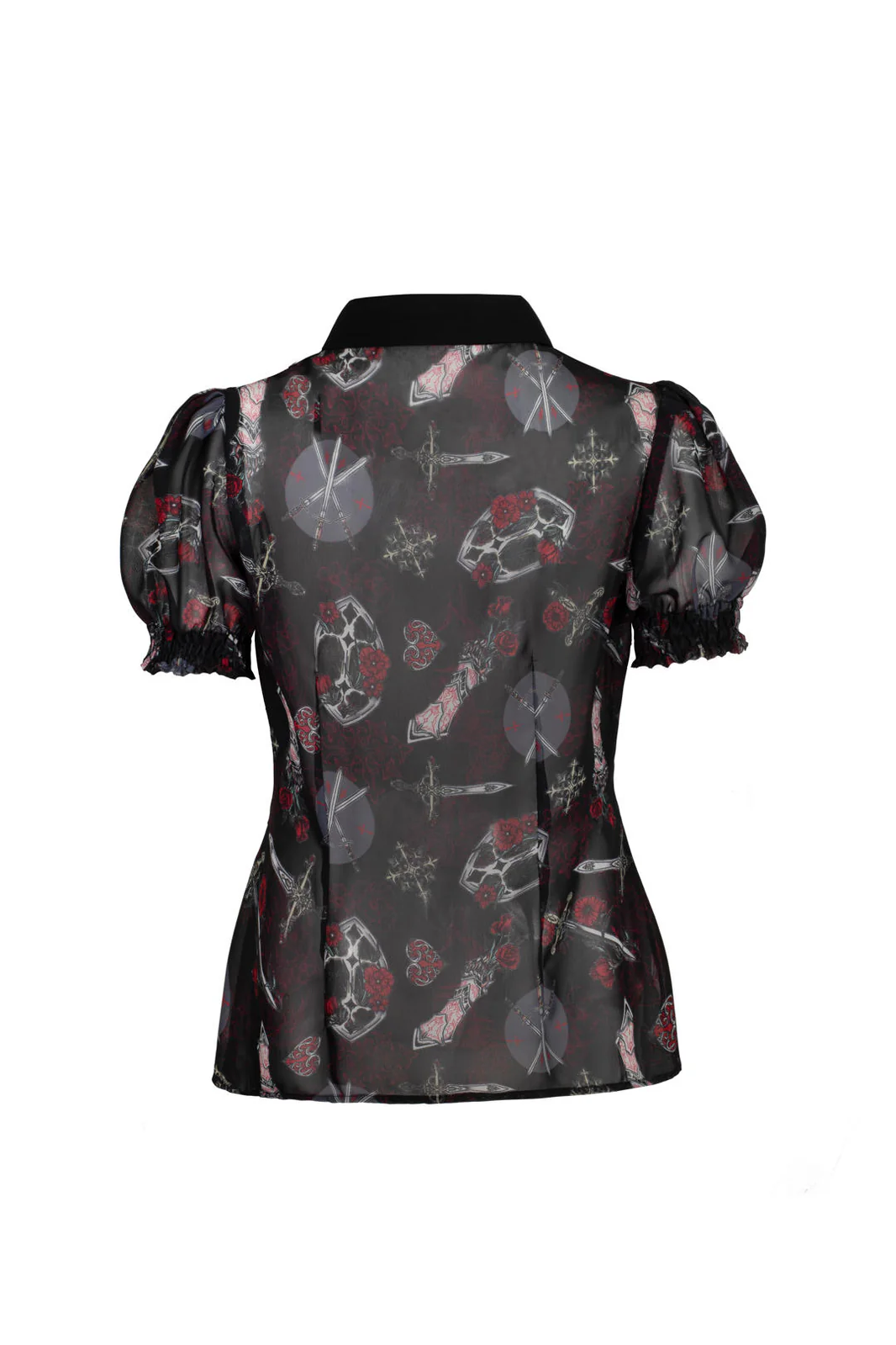 The Hell Bunny Clarimond blouse brings a sturdy yet fluid alternative to the gothic aesthetic. The black chiffon is enlivened by a striking armor and sword pattern, giving the blouse a strong visual identity.