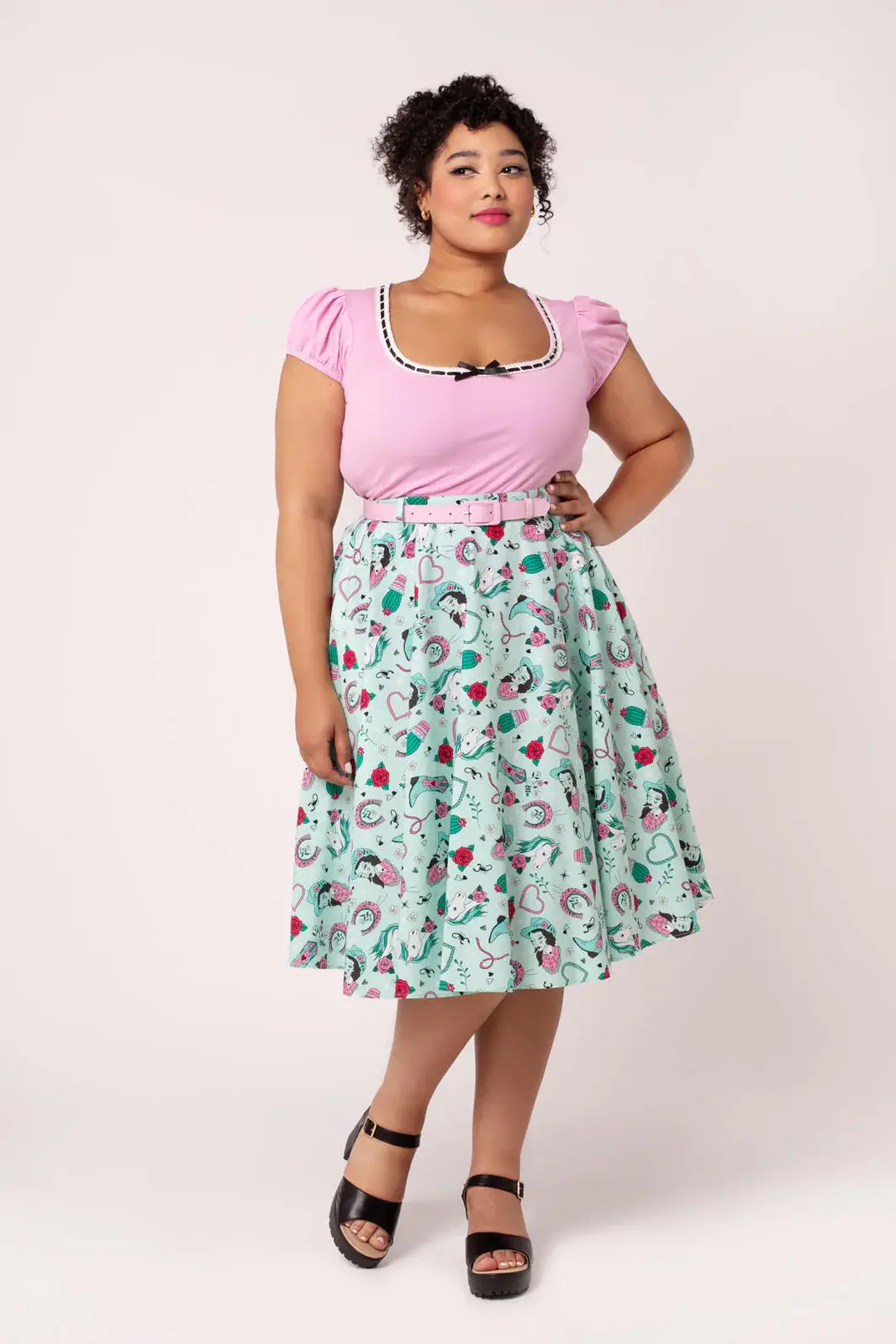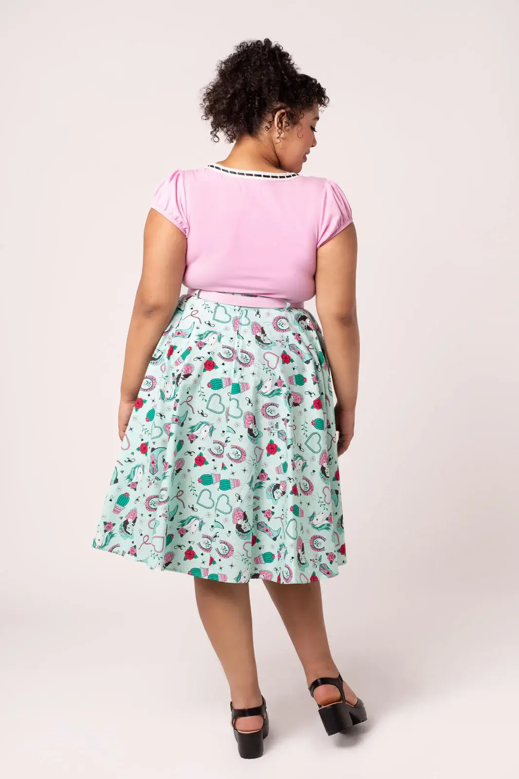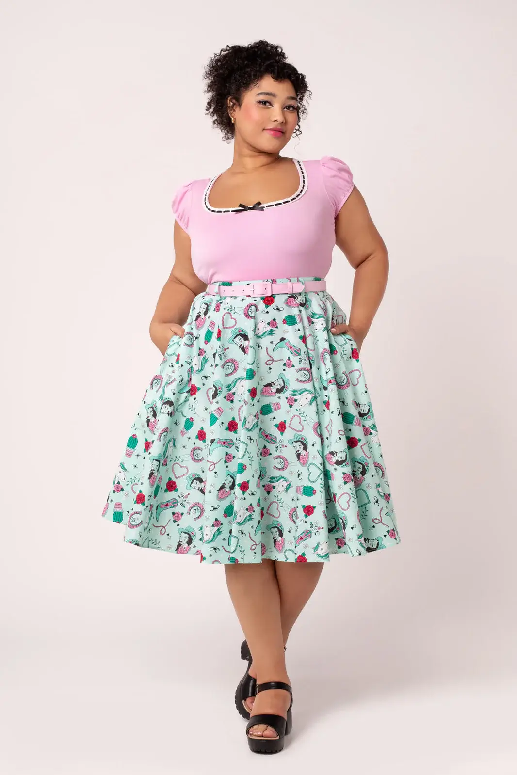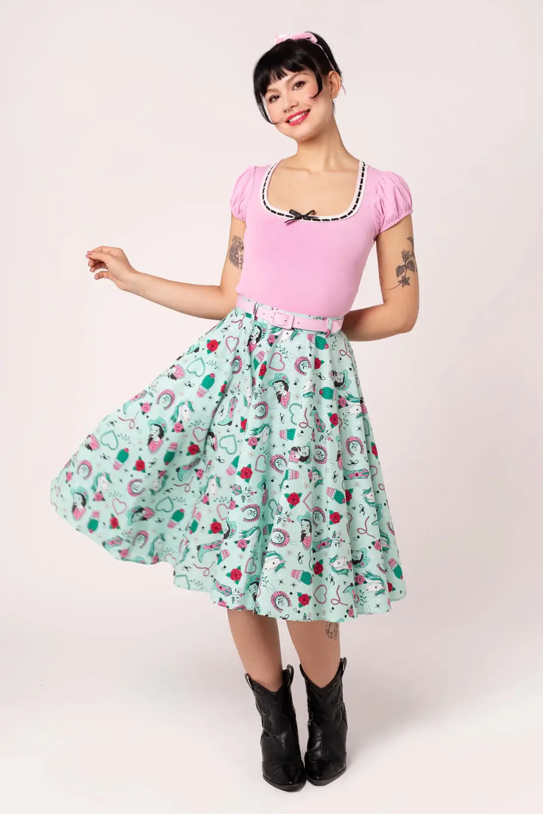 The Hell Bunny Kellie bell skirt brings a touch of the Wild West to a vintage silhouette. The mint green cotton fabric is adorned with horses, cowboy boots and cacti – a playful yet thoughtful pattern that stands out.
