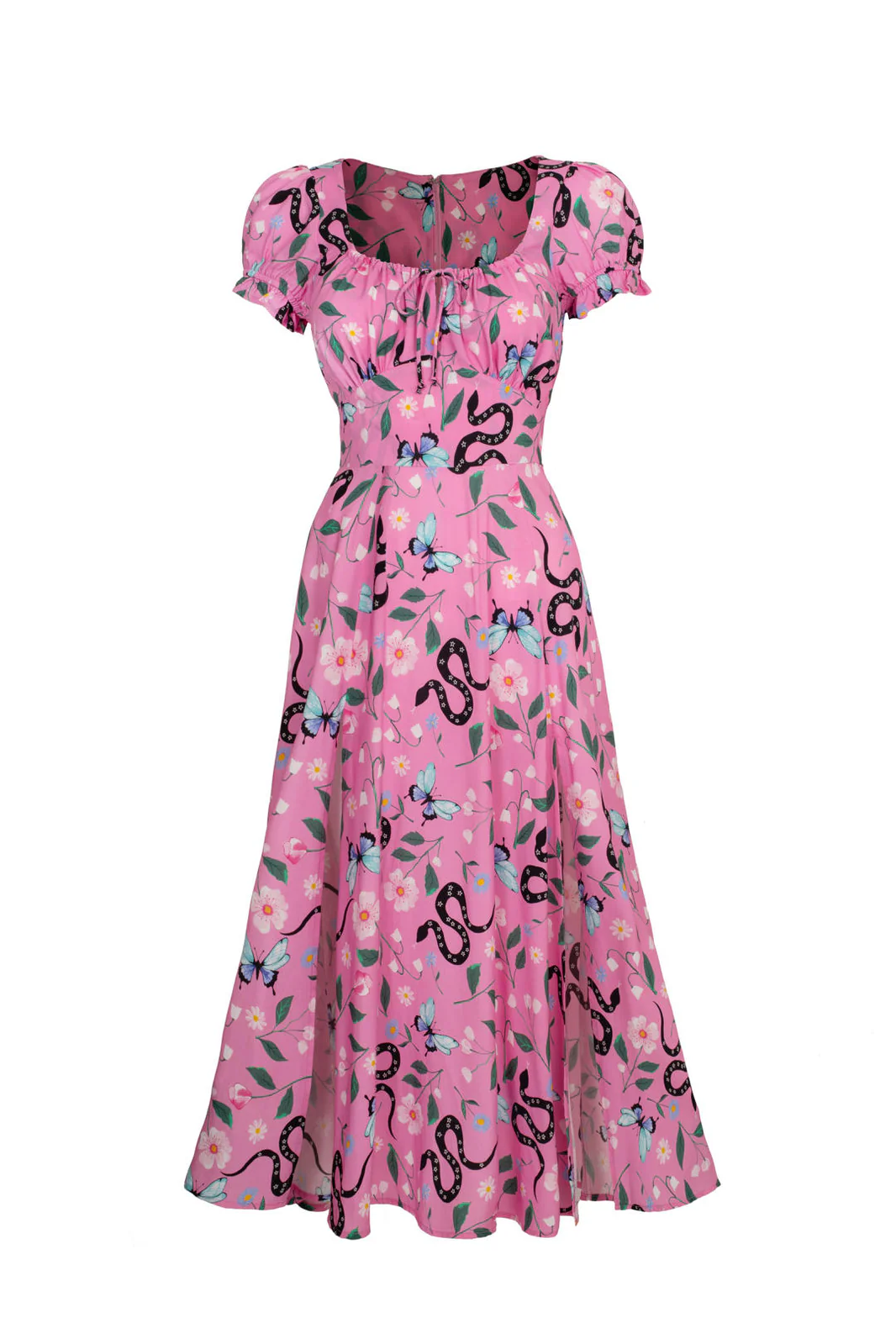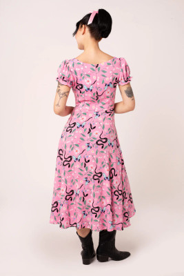 The pink Ma Boheme midi dress charms with floral, butterfly and snake prints. The fit is completed by a shaped top and a gently flowing hem.