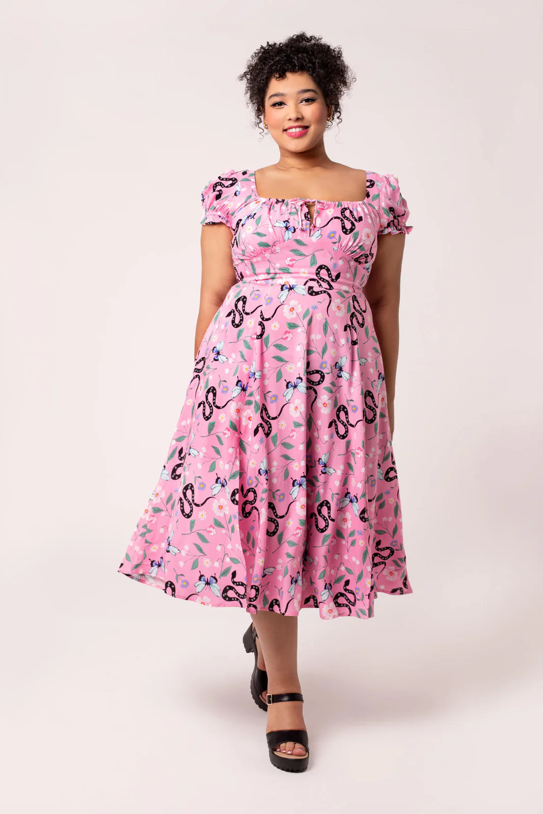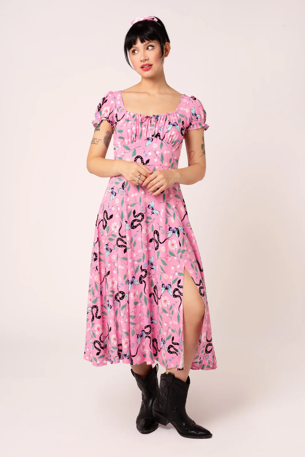 The Ma Boheme midi dress doesn't stand out. Its pink base comes to life with a detailed pattern of butterflies, flowers and snakes that create a captivating contrast — soft and a little wild at the same time.