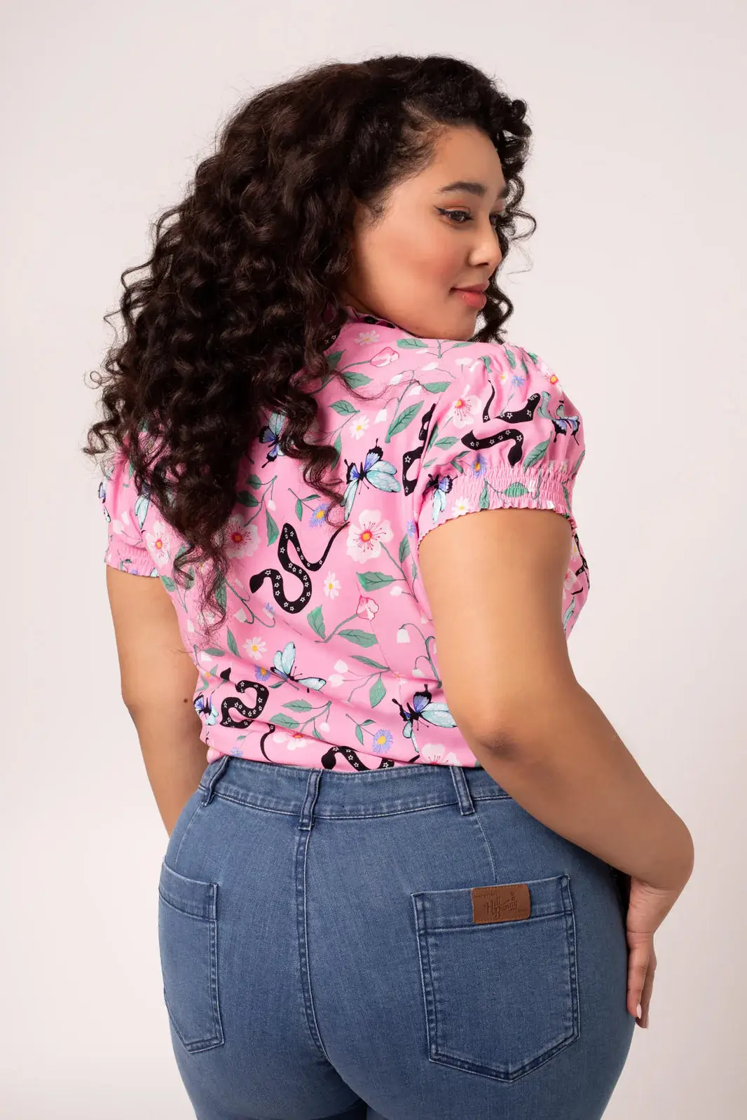 The Ma Boheme blouse brings softness and a little attitude to the same pattern. Flowers, butterflies and snakes running on a light pink background create a combination that is both delicate and eye-catching.