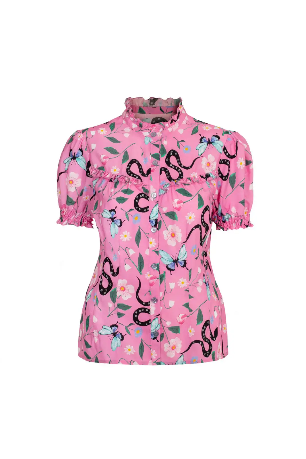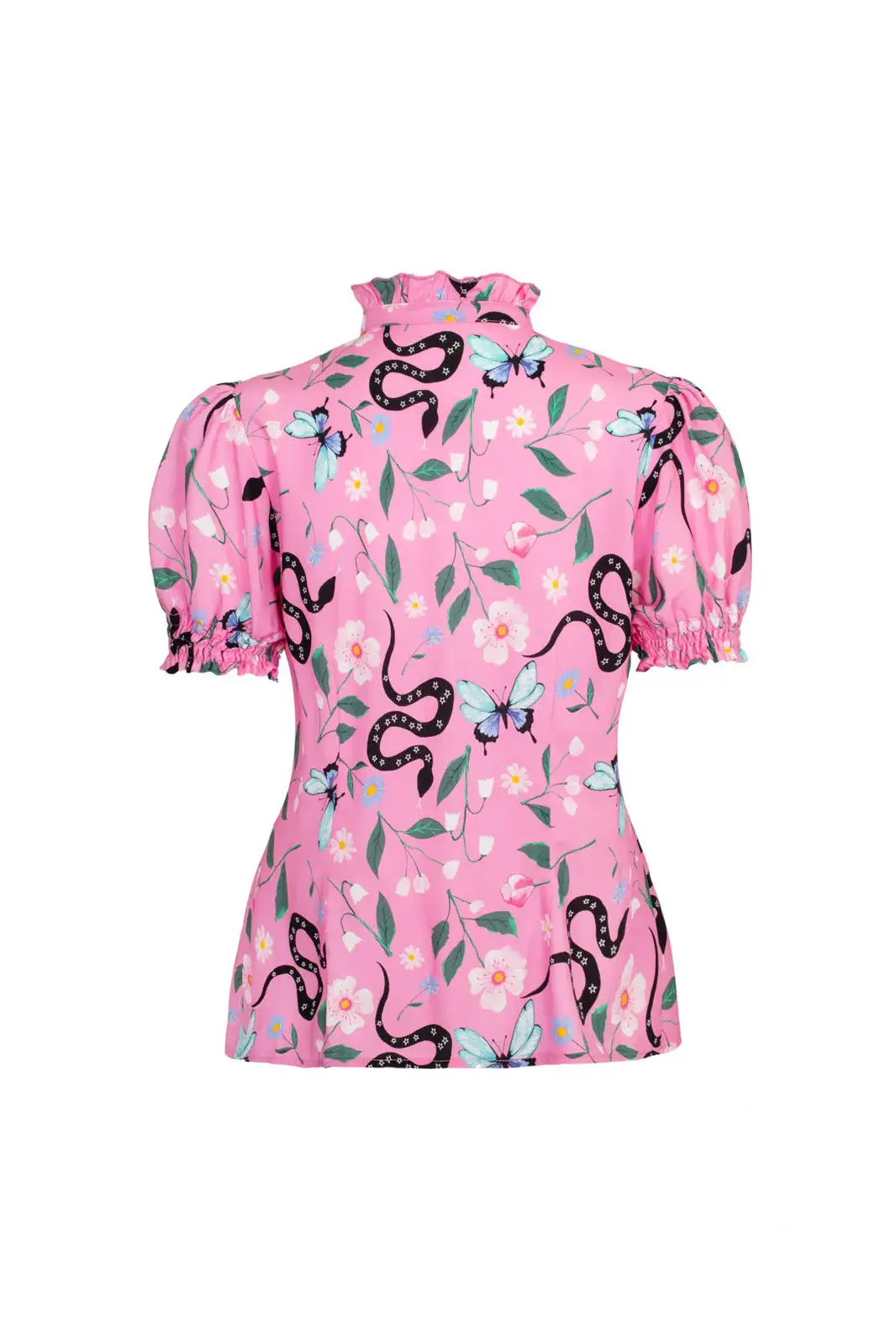 The Ma Boheme blouse is charming with a pink base and snake, butterfly and flower patterns. The ruffled neckline and puff sleeves bring lightness to the look.