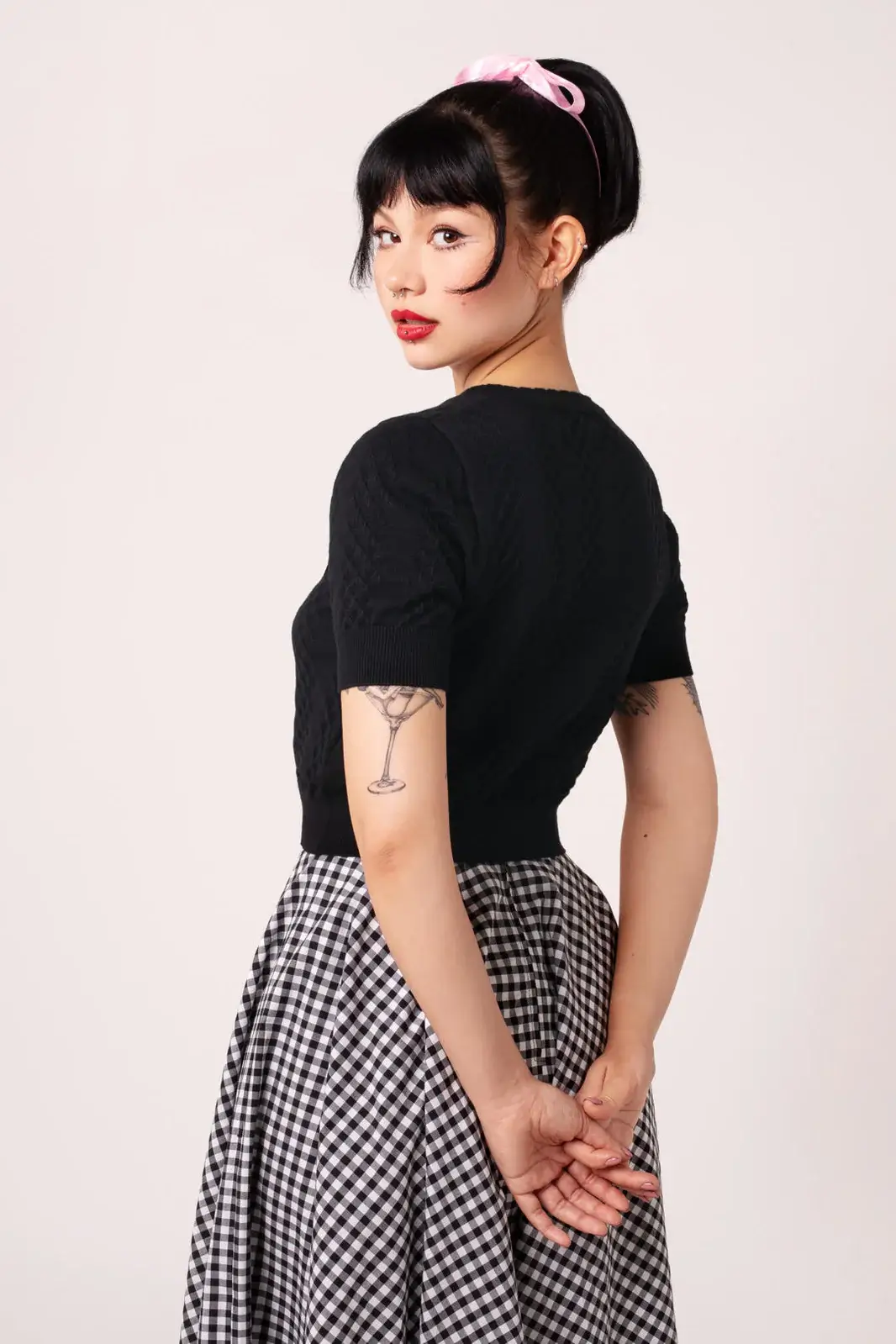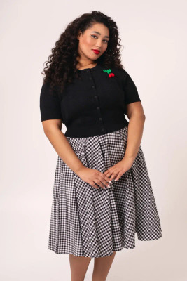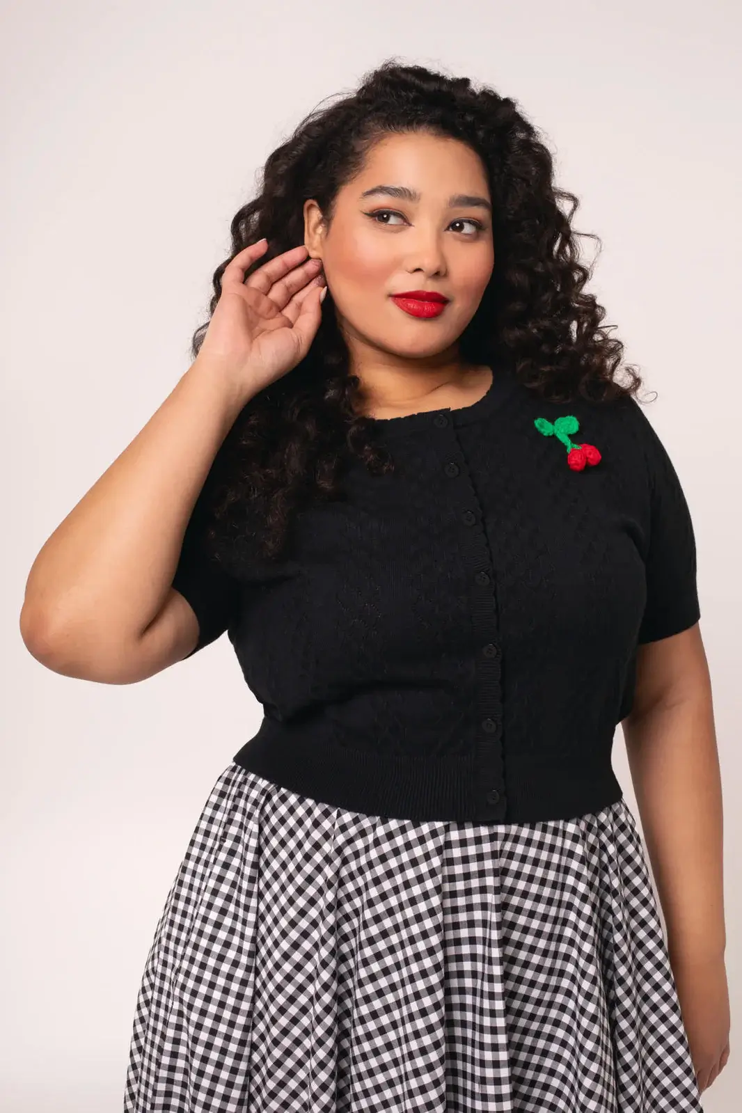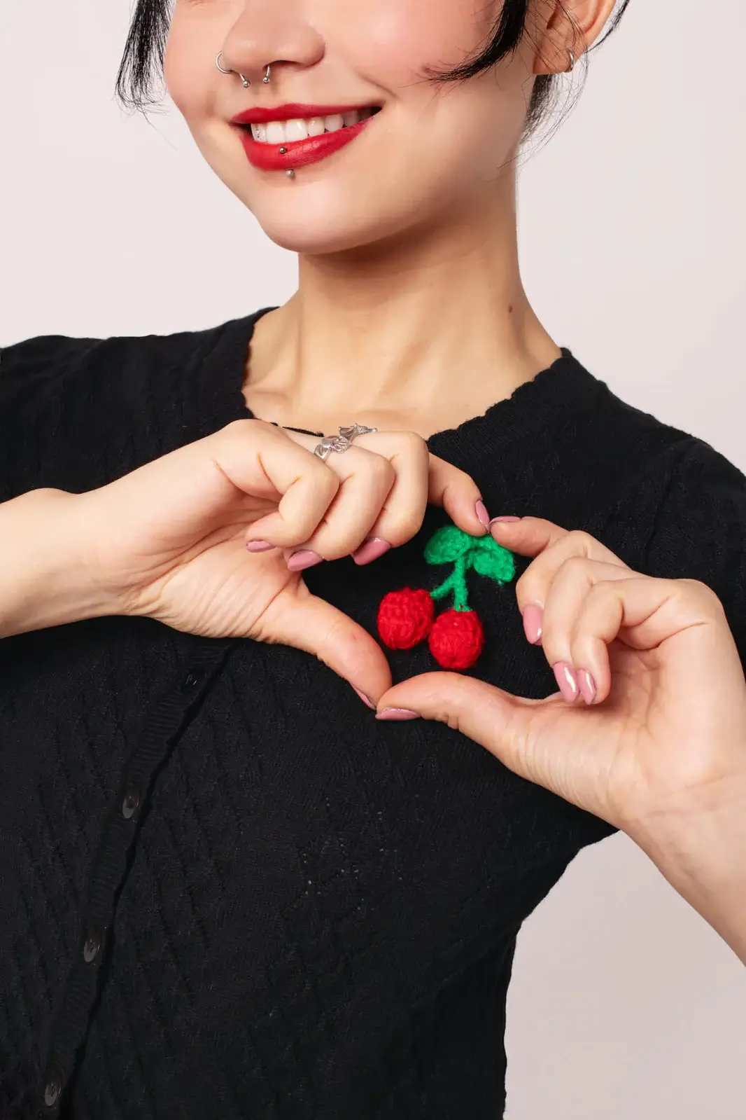 The Claudie cardigan is a small but impressive piece. Its body-hugging cut accentuates the silhouette, and the detachable cherry lapel pin adds a touch of playful vintage flair.