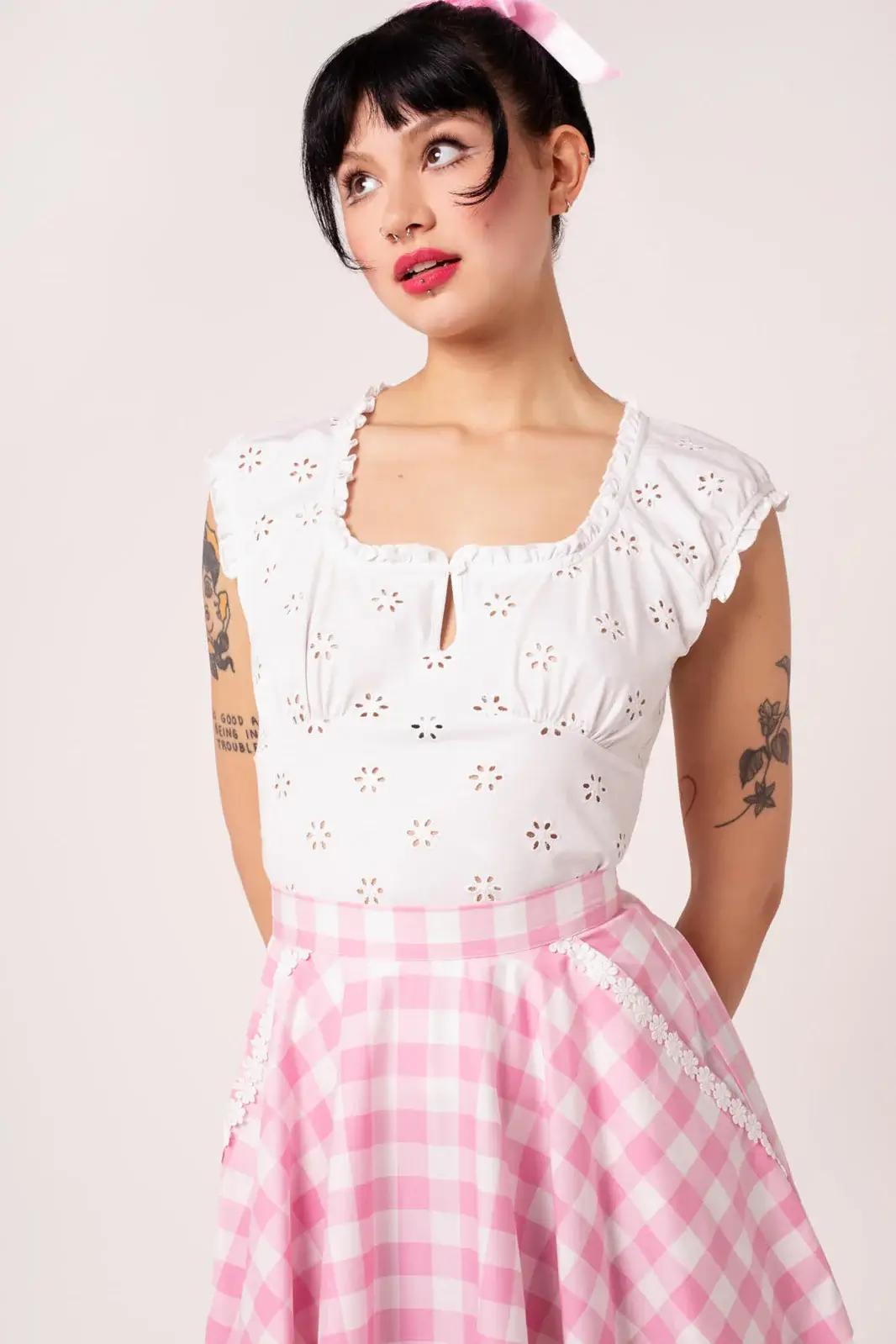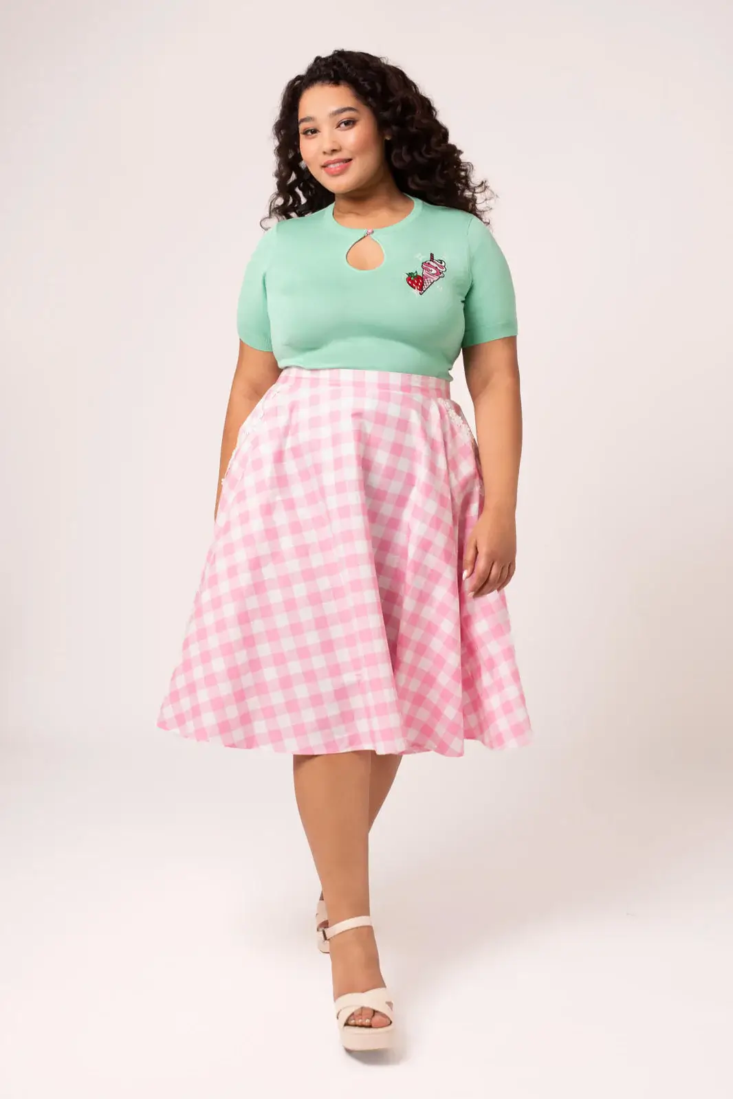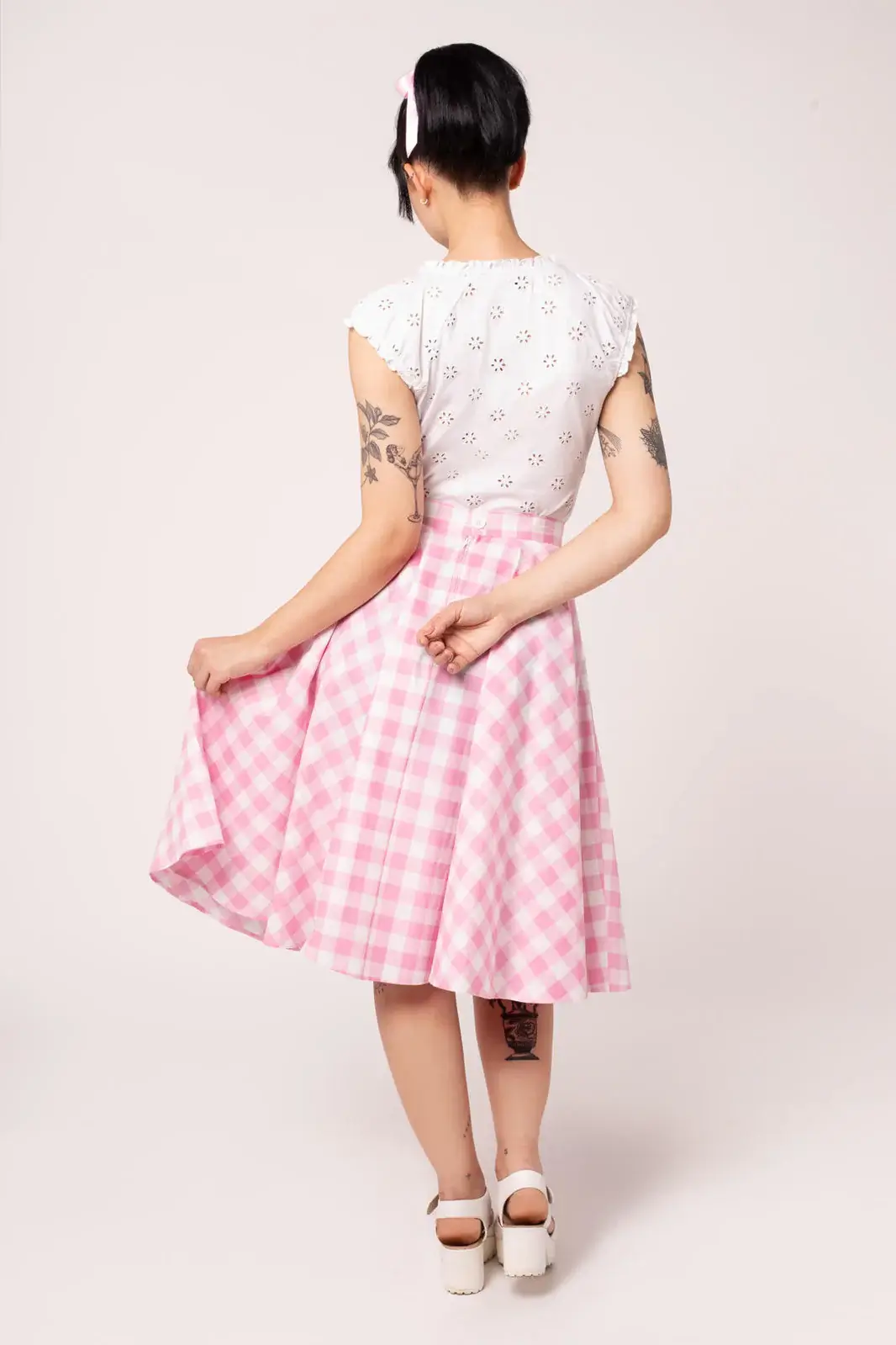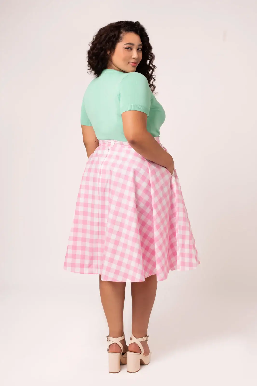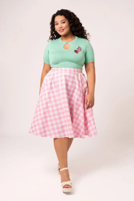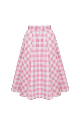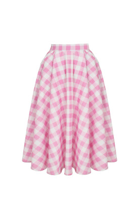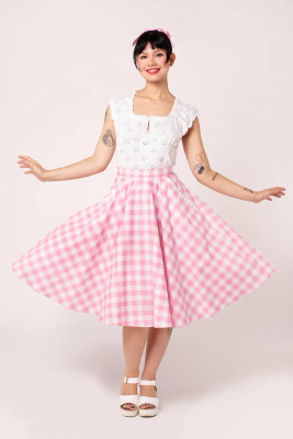 Cindy is a classic 50s-inspired bell skirt in a fresh pink and white gingham check. The full circle hem falls beautifully from the waist and gives just the right amount of volume - perfect with a petticoat.