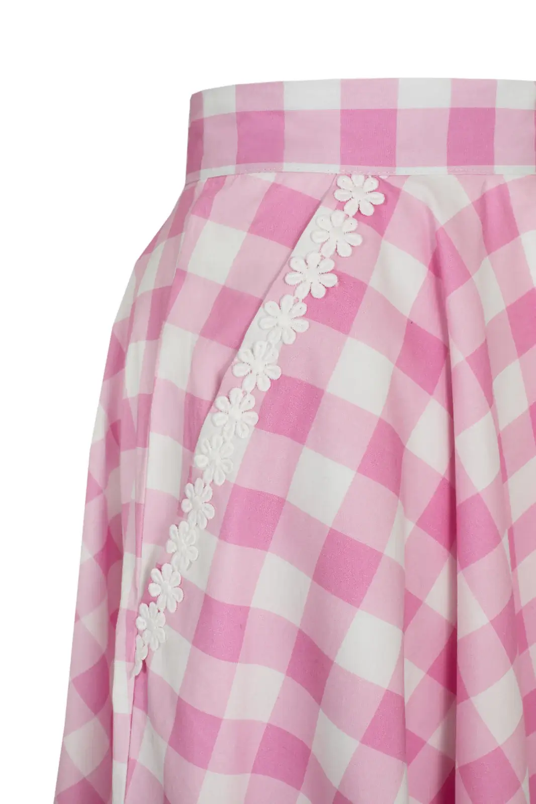 A 50s style pink and white gingham full circle skirt. Full circle hem, pockets with lace trim and a tight waist without elastic.
