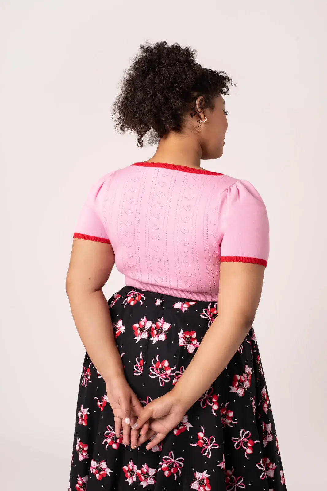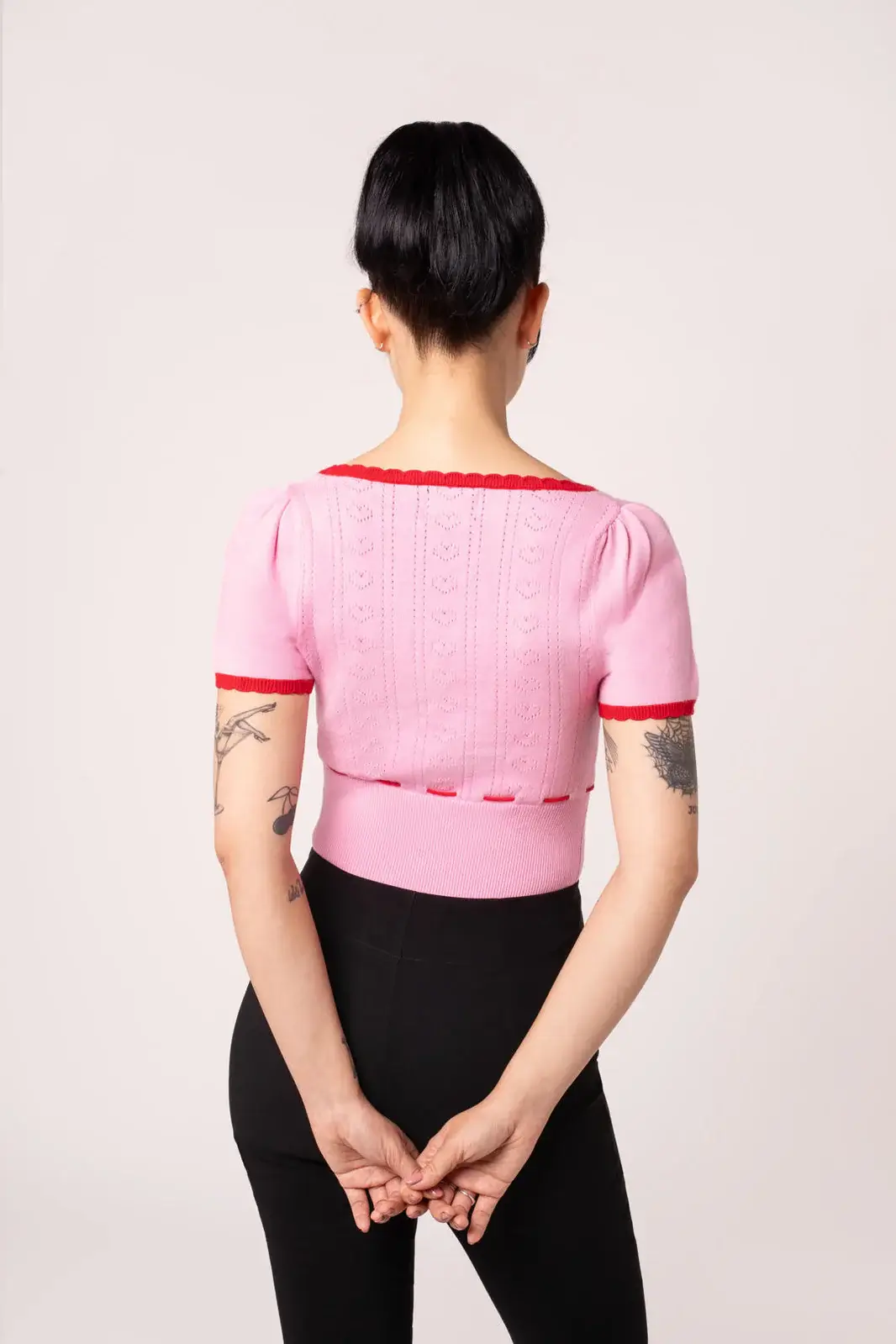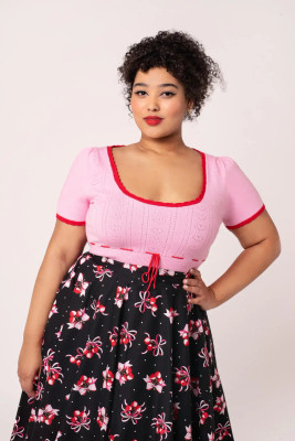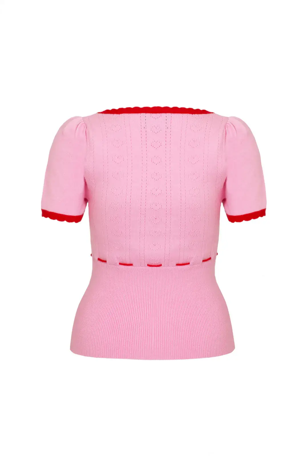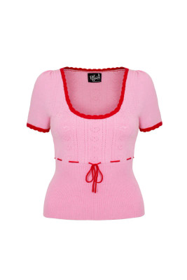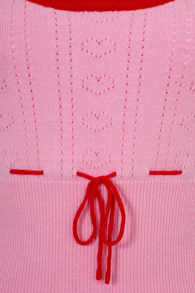 Pink retro knit top with a jacquard heart pattern. Red scalloped edges and bow detail on the front.