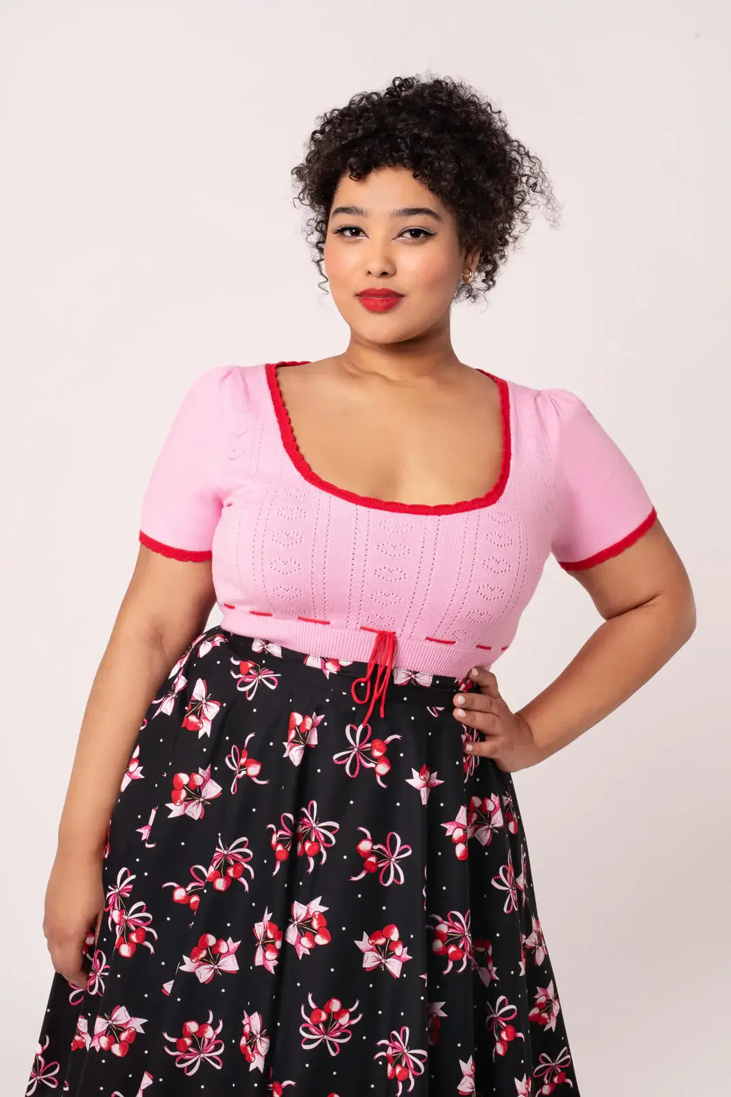 This retro-inspired knit top features a woven jacquard heart pattern that adds a light texture without making the whole thing feel too fussy. The neckline and sleeve edges are finished with red scalloped edges that neatly frame the design.