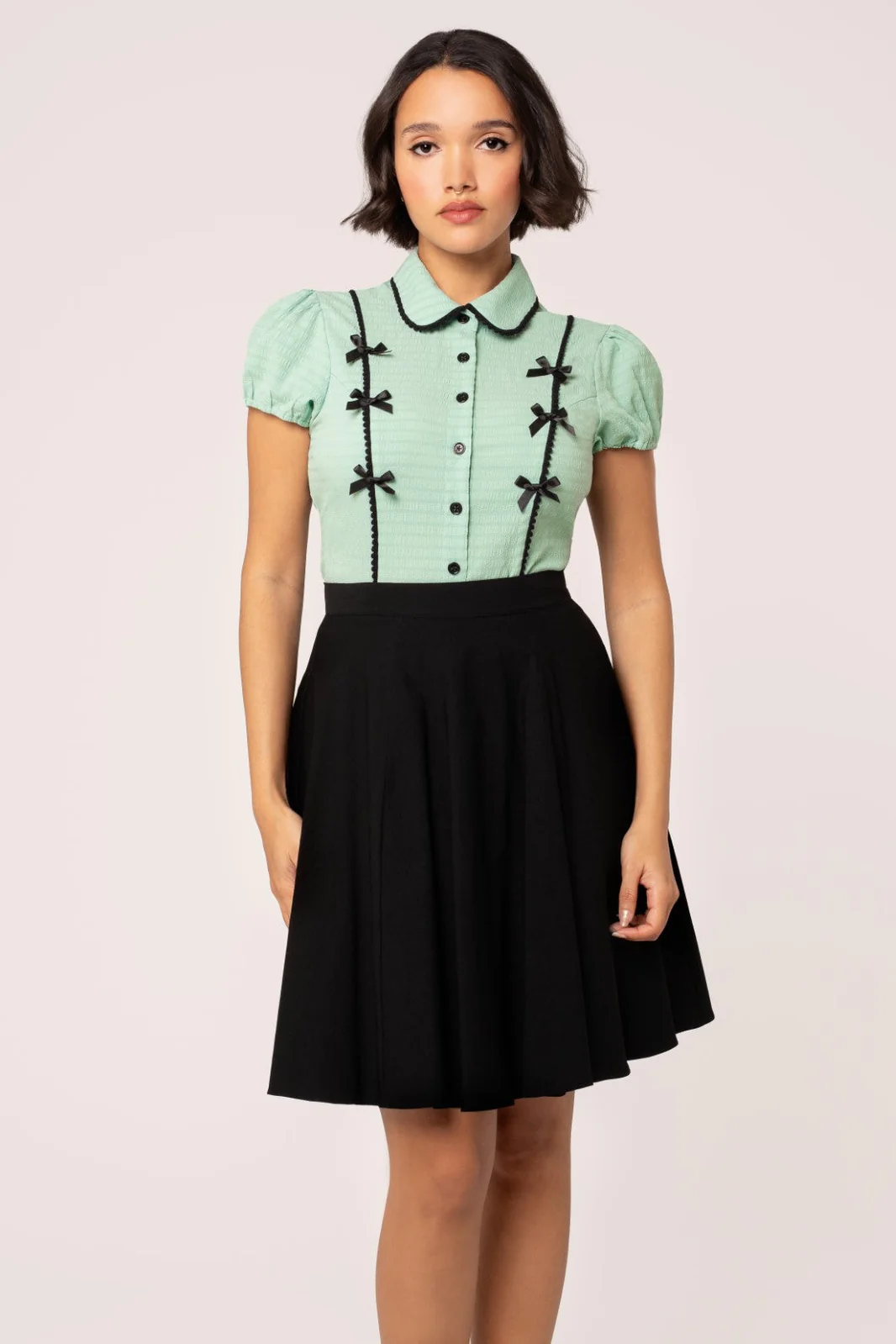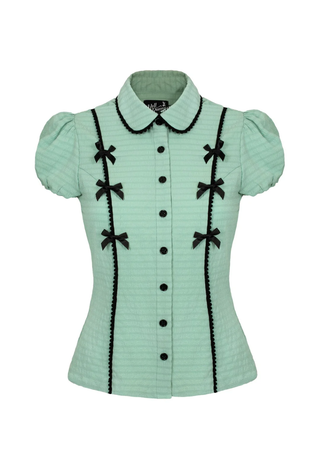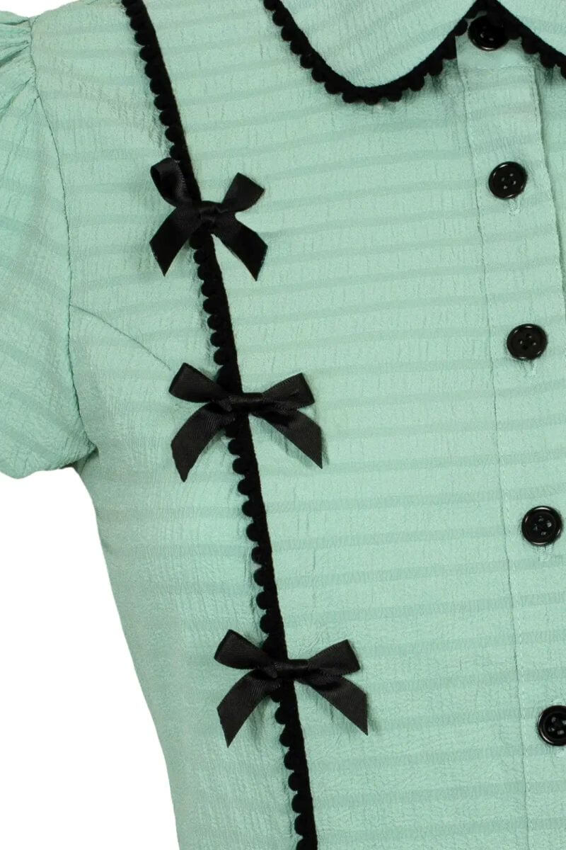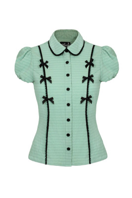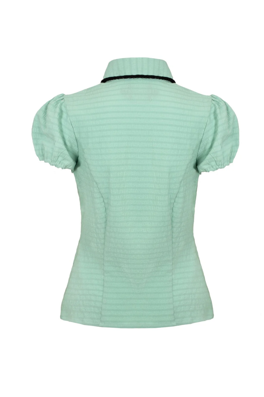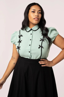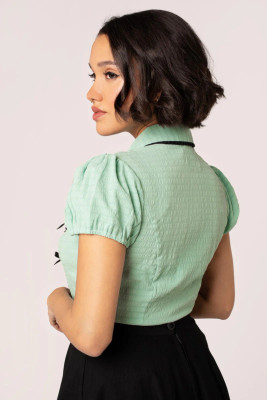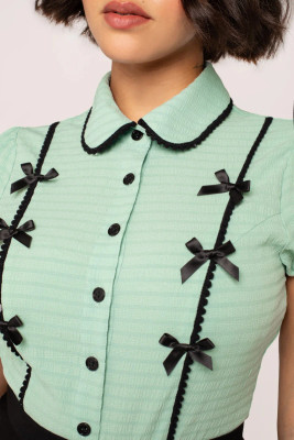 The mint green base color and black details create a clear contrast that emphasizes the retro look of the blouse. The black decorative trim along the front and small bows give the blouse a light vintage feel.