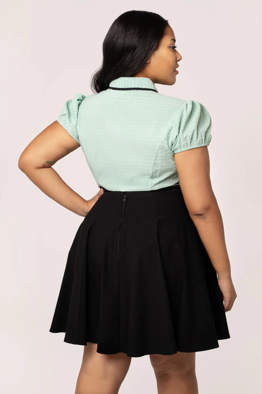Mint green retro blouse with black bow details. The collar, puff sleeves and stretchy fabric bring a 50s vibe.