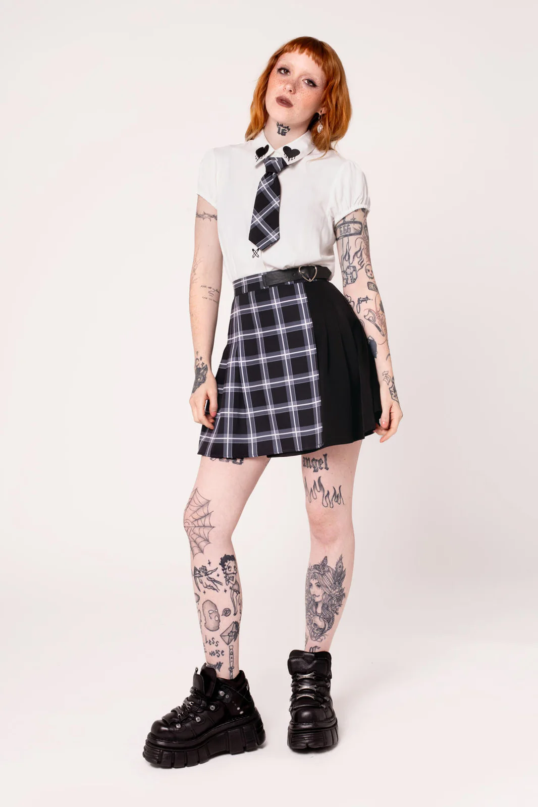 A white blouse with a heart-embroidered collar, safety pin details and a detachable tartan tie. Preppy style meets a light punk twist.