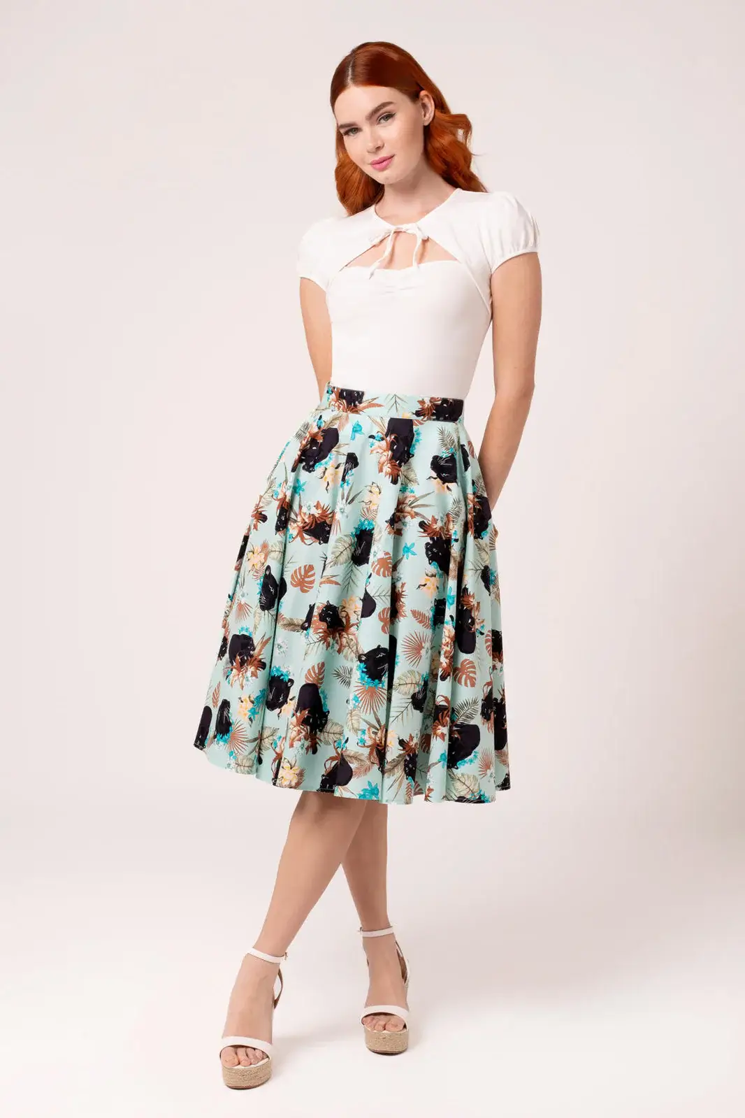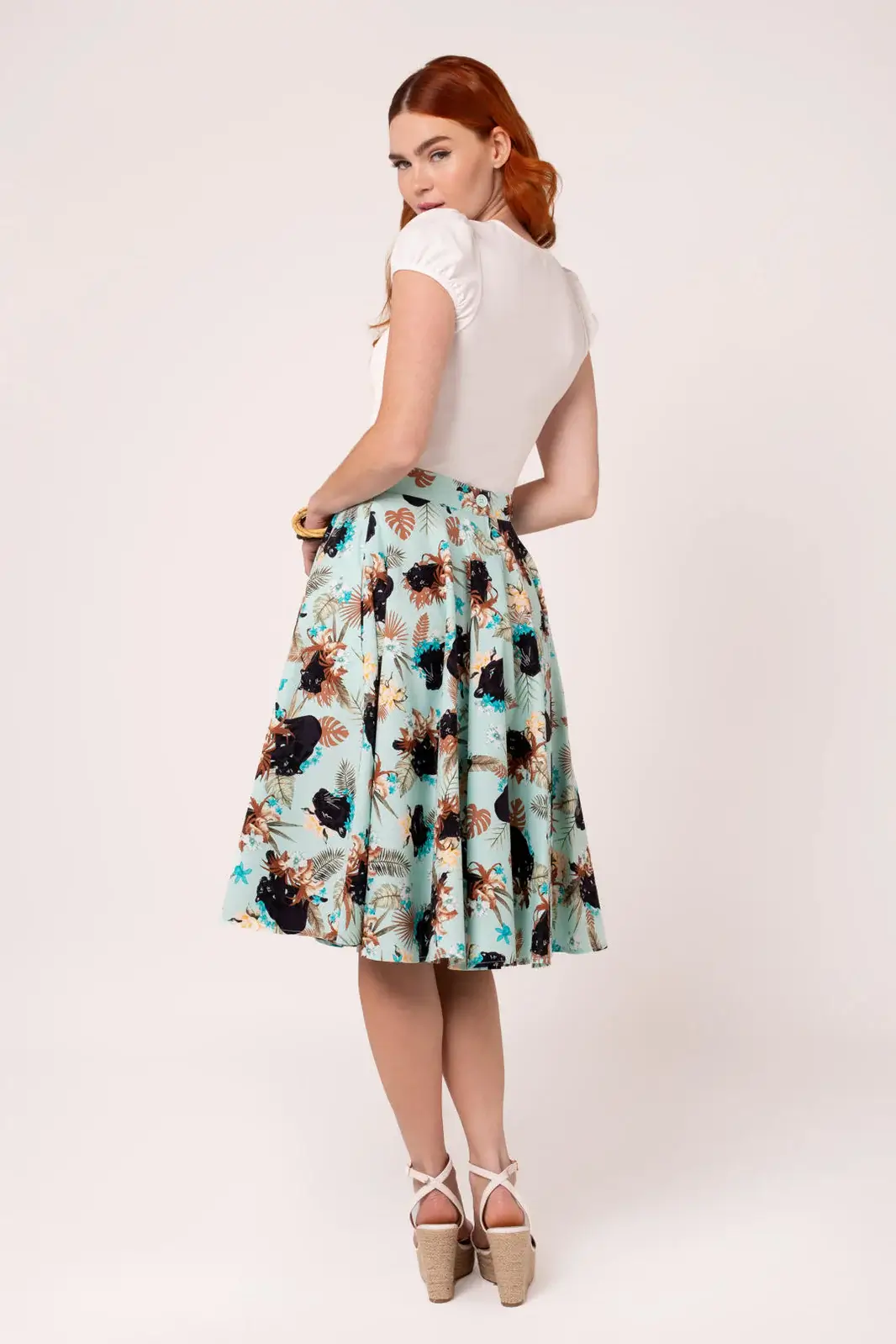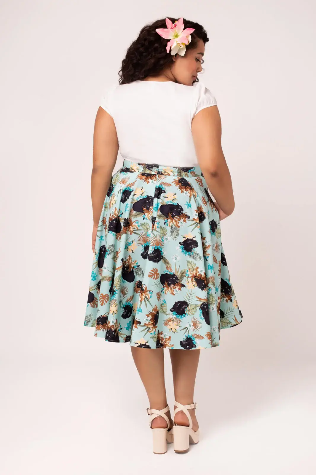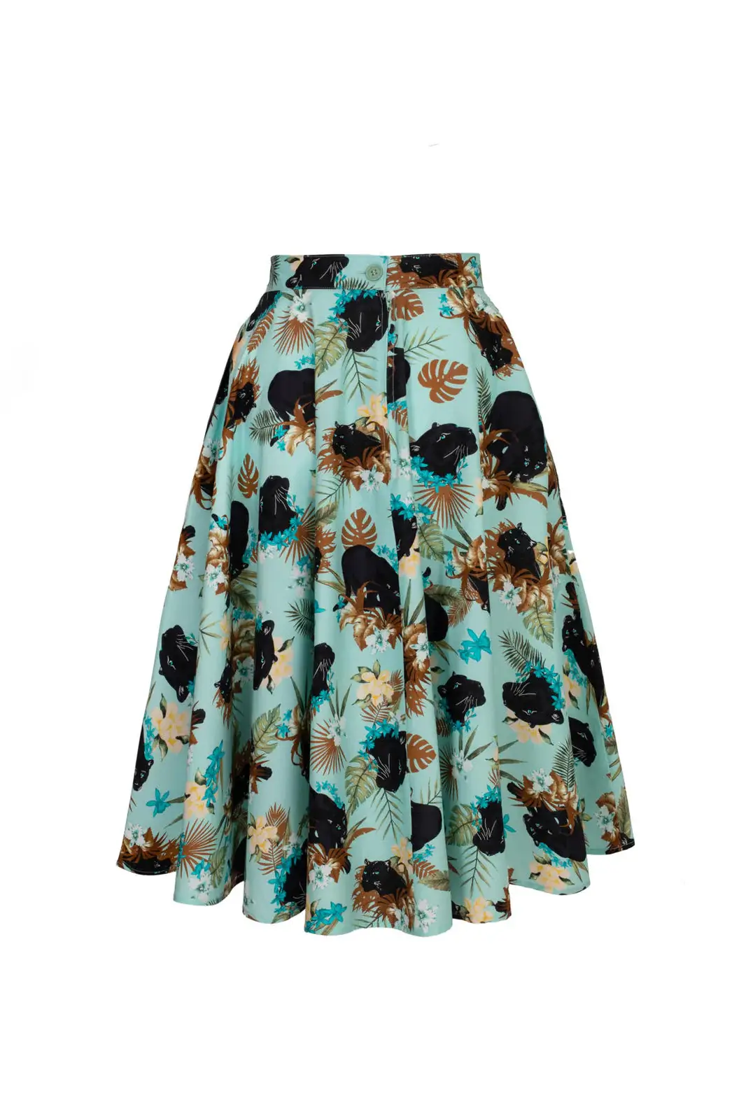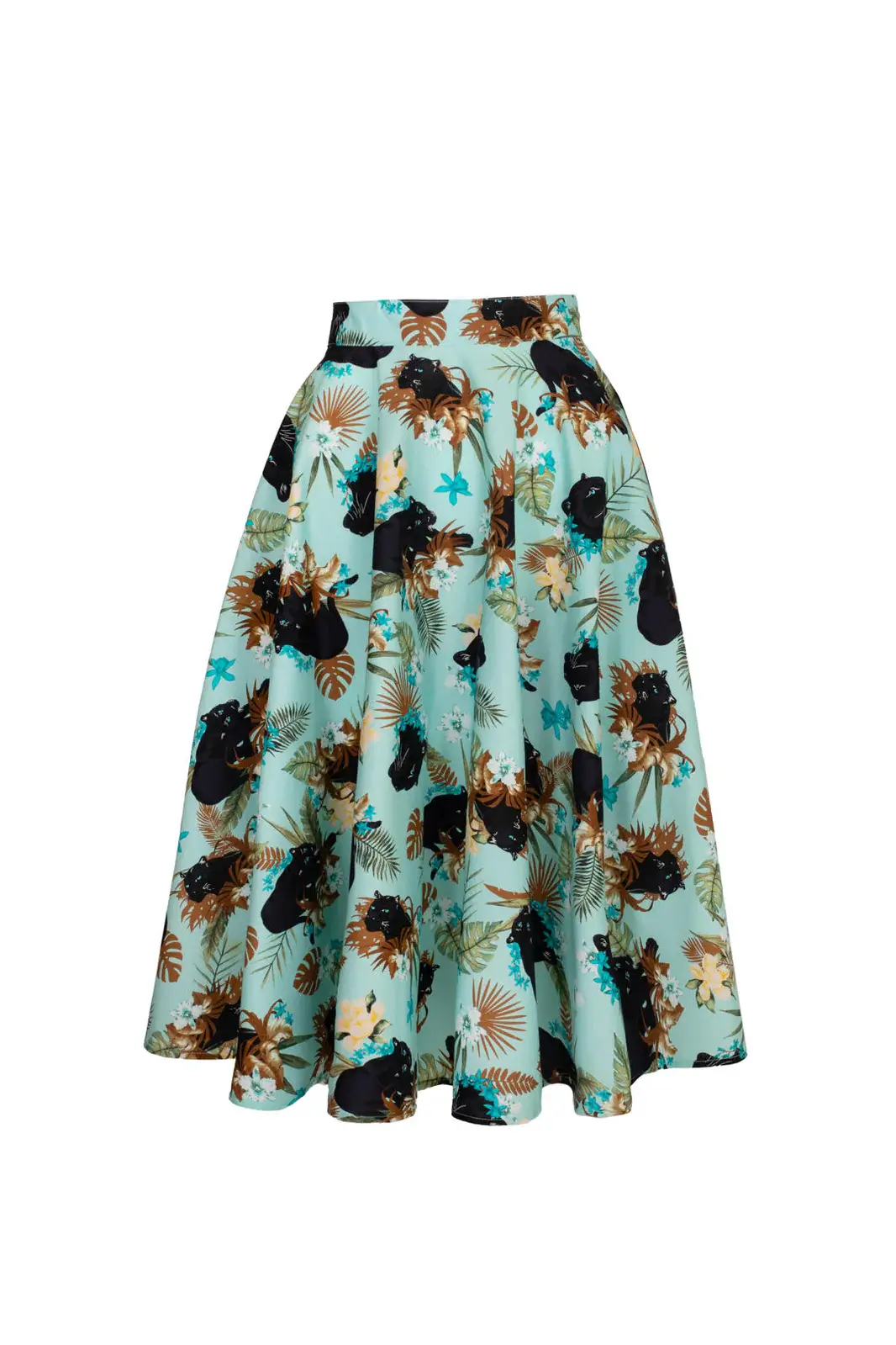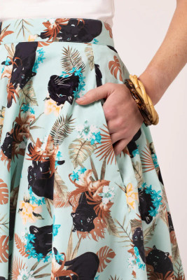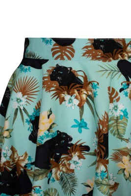 The light blue bottom is decorated with a striking pattern of panthers moving among flowers and lush vegetation. The pattern makes the skirt an eye-catcher that works just as well on a summer day as at events.