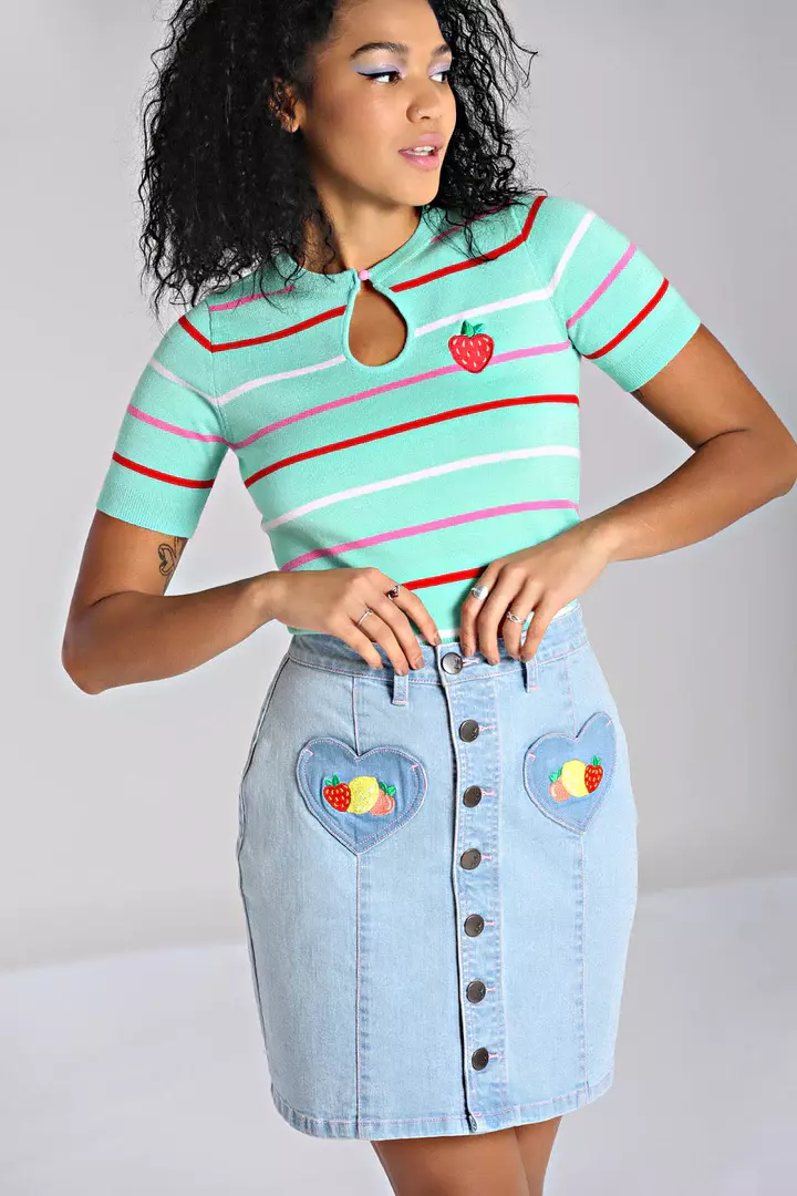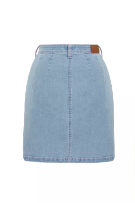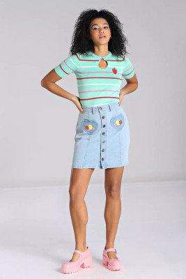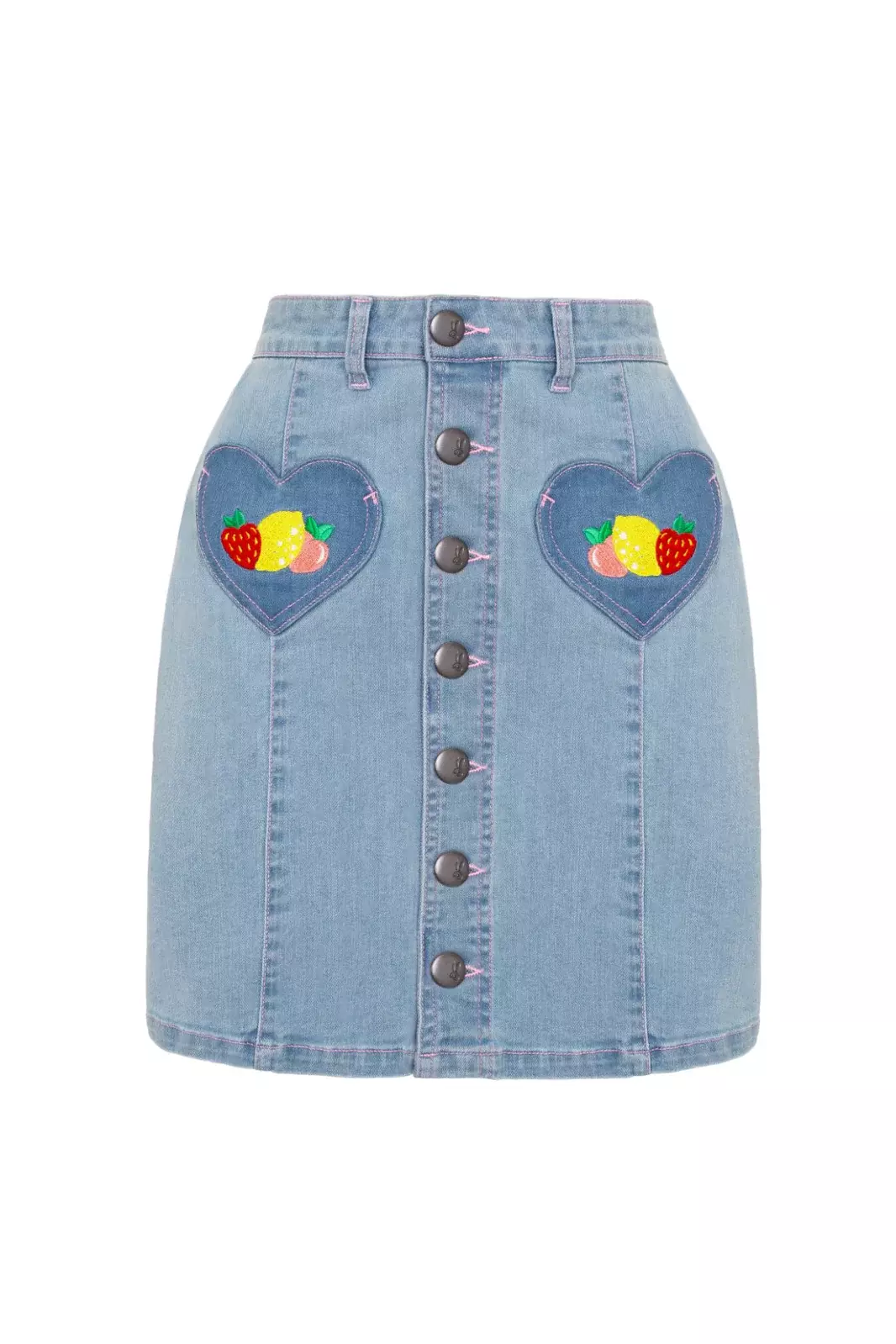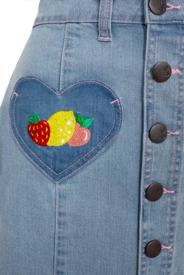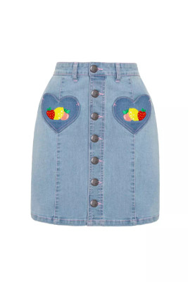 Stretch denim fitted mini skirt light blue denim with darker denim heart pockets