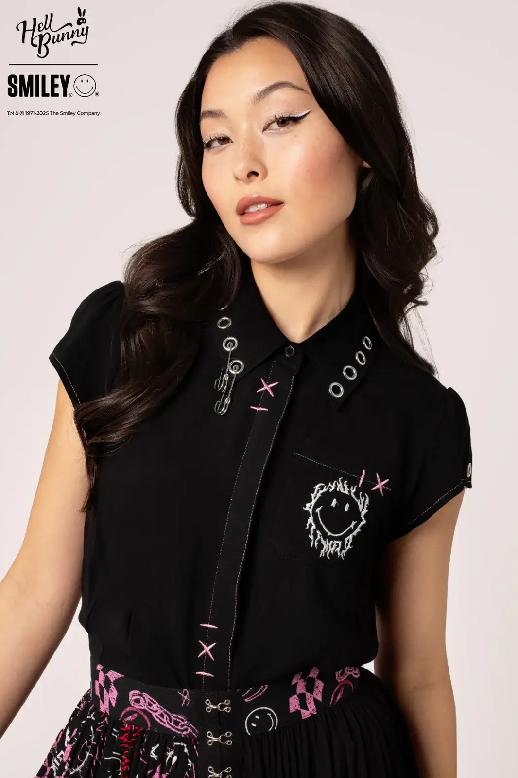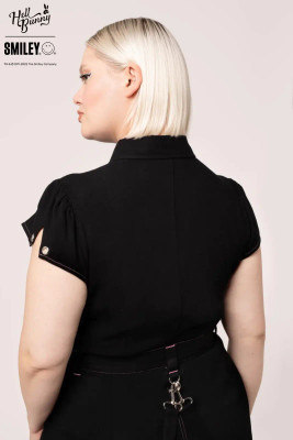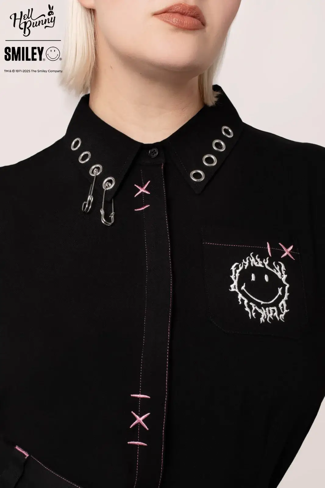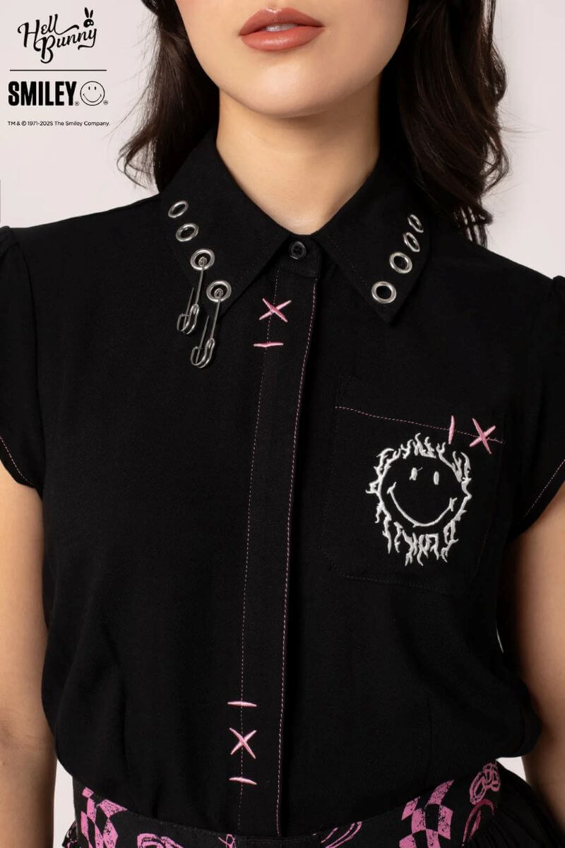 Osa Hell Bunnyn ja Smiley® Originalsin yhteistyötä, Dylan-paita on musta paitis täynnä asennetta. Terävä kaulus saa uuden ilmeen hopeisista rengasniiteistä ja irrotettavista hakaneuloista, jotka tuovat mukaan annoksen kapinaa. Piilotettu nappilista ja rintatasku on viimeistelty pinkeillä tikkauksilla ja Smiley®-kirjonnalla. Halkiohihat ja kontrastiyksityiskohdat viimeistelevät tämän lantiomittaisen viskoosipaidan, joka on kaikkea muuta kuin tavallinen.